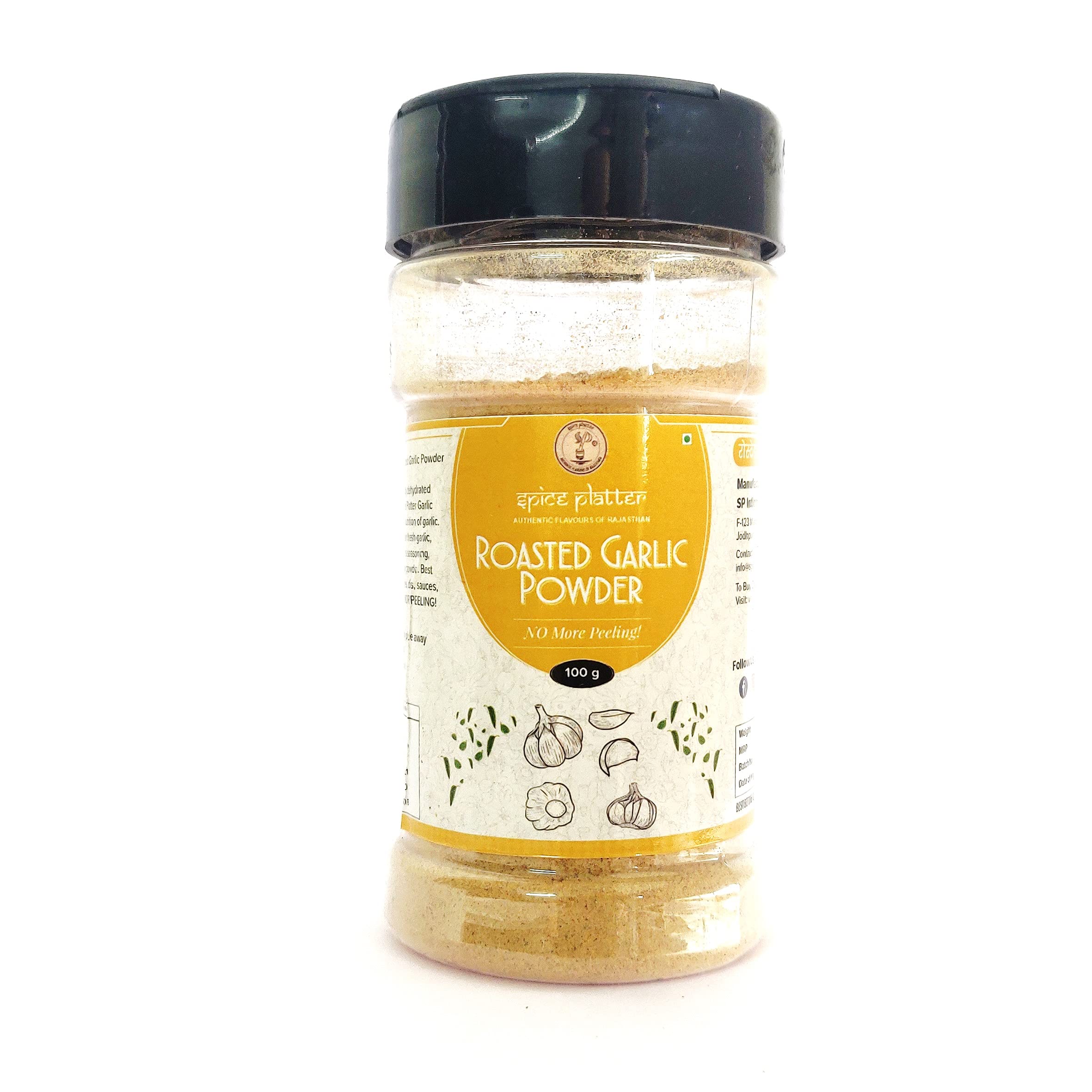 Having Roasted Garlic Powder in a kitchen cabinet can be very useful as it is a quick way to add lots of flavours to a dish. Spice Platter Roasted Garlic Powder is made by dehydrating roasting and grinding fresh & handpicked garlic cloves. Say Bye! to the hassle of peeling & chopping garlic cloves and substitute it with Spice Platter Garlic Powder! A quick way to add lots of flavours to any dish. Garlic Powder is more concentrated than fresh garlic cloves. Being Roasted it can be used as a seasoning on pizza pasta & sandwiches to add zing of garlic. No raw taste of garlic only convenient blast of flavours Ideal for flavouring to dishes in marinades and salad dressings