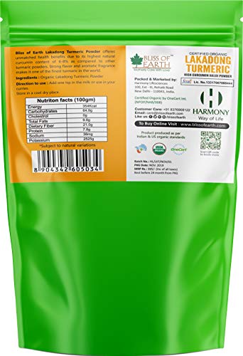 Bliss of Earth Organic Lakadong Turmeric Powder Bliss of Earth Lakadong Turmeric Powder is an organic versatile herb known for centuries for its health benefits. It offers an unmatched health benefits due to its highest natural curcumin content of 6-8% as compared to other turmeric powders. Grown in the hills of the Lakadong Village in Meghalaya Iindia this turmeric powder not only has a rich colour but also an intense flavour. It also has an aromatic fragrance that shows well when used in curries. Its natural flavor makes a perfect addition to your favourite curries vegetables or milk.