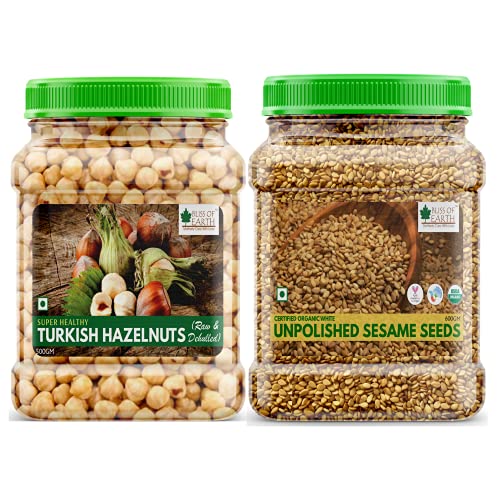 Bliss of Earth Turkish Hazelnuts are powder packed with nutrients including vitamins minerals anti-oxidants and healthy fats. Hazelnuts can be consumed as a raw snack roasted or added to baked dishes such as cake chocolates & shakes. All in all hazelnuts are an excellent and delicious source of nutrients for a healthy diet. Hazelnuts offers various health benefits including regulating blood pressure Direction for use: Consume raw roasted or salted. Add to your cake chocolates or shakes. Ingredients: Raw Dehulled Hazelnuts Country of Origin: Turkey dehulled and are an excellent source of coppercalciumomega fatty acidsiron magnesiumphosphorus zinc and selenium. Sesame seeds are also a good source of fiber with a rich nutty flavour. Called the queen of oil seeds these tiny seeds are a go to topping on breadstick and burger buns.