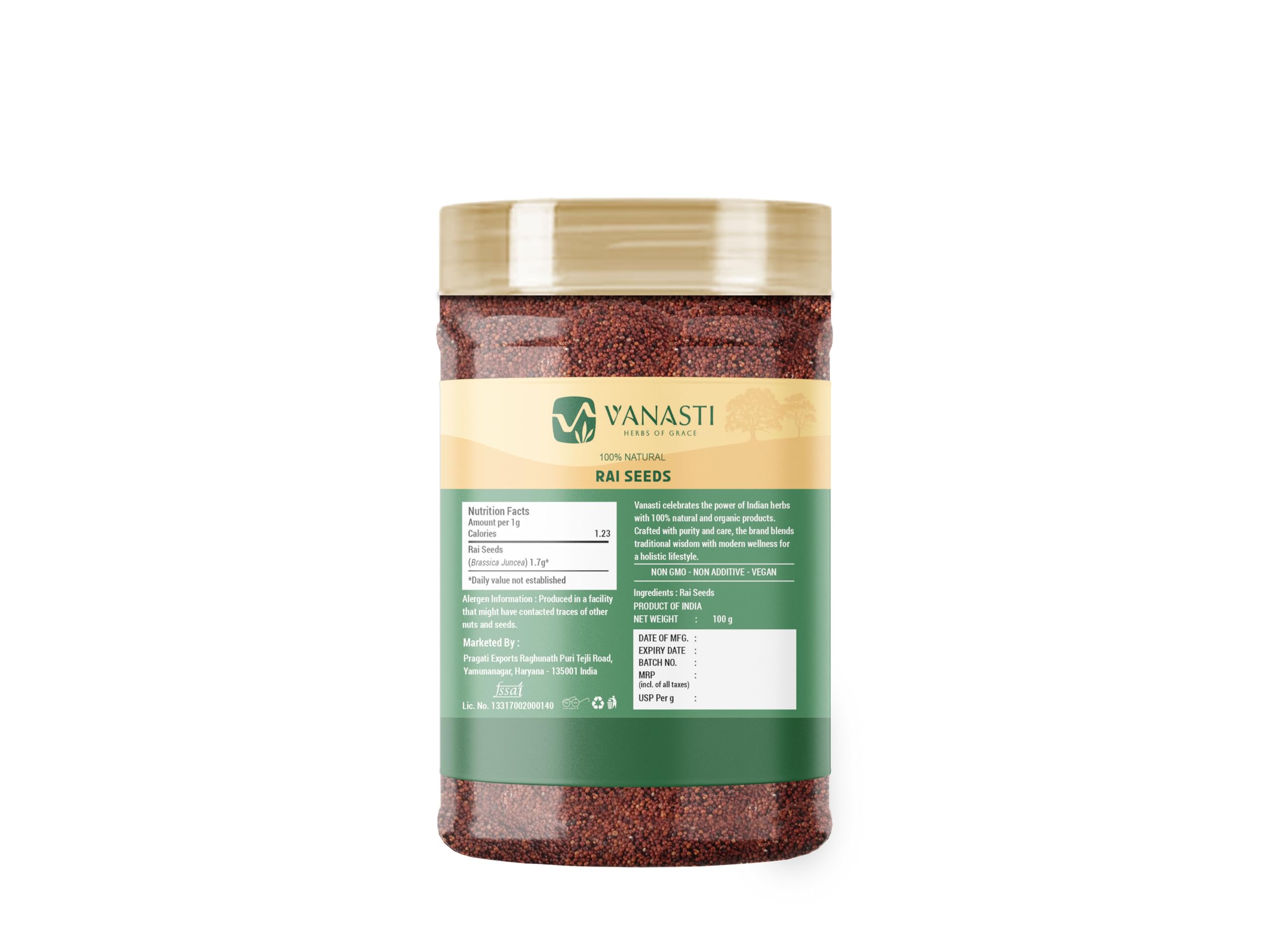 Rai Seeds (Red Mustard Seeds) are small, reddish-brown seeds valued for their sharp flavor and nutritional content. They are commonly used whole, ground into powder, or as a condiment in soups, stews, curries, and salads. Red Mustard Seeds are a source of vitamins such as vitamin A, C, and K, as well as minerals including calcium, magnesium, phosphorus, and potassium.