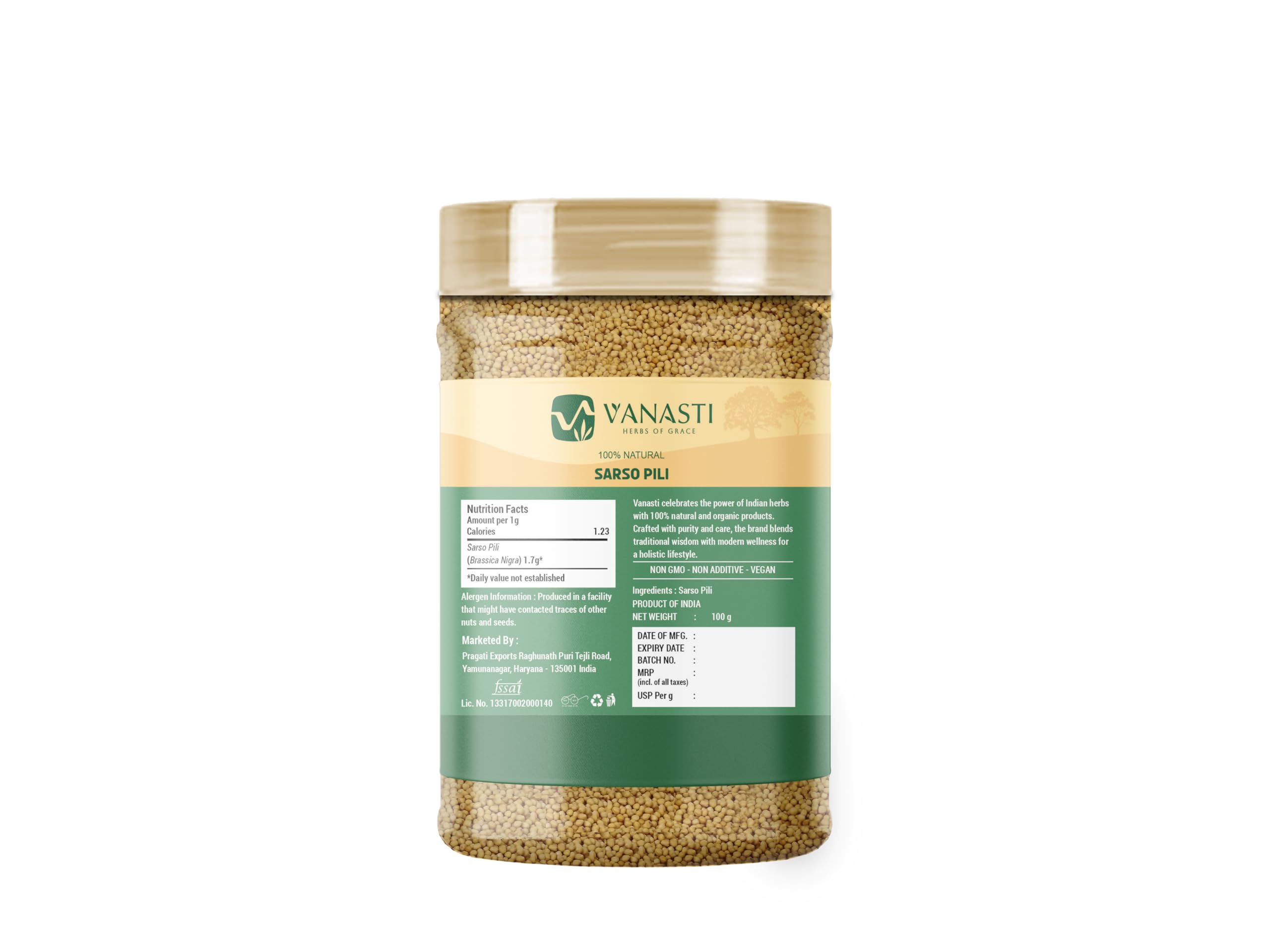 Sarso Pili (Yellow Mustard, Sinapis alba) is an annual plant originally from the Mediterranean and now grown worldwide, including India. Its pale yellow seeds have a mild flavor and are widely used as a spice and in making mustard condiments. Commonly added to pickles, curries, and other dishes, these seeds contribute a subtle aroma and taste.