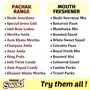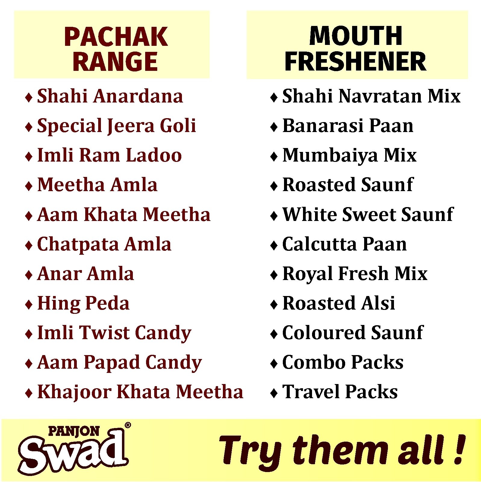 • TRY US ALL : 20 flavours of Swad Mouth Fresheners Churans Mukhwas Paan Anardana Jeera Goli Aam Papad Navratan Mix White Sweet Saunf Alsi & more. 5 Flavours of Swad Candy. Perfect gift for Anniversary Hajmola Delight Foods Nuts Berries Supari Seeds Trail M