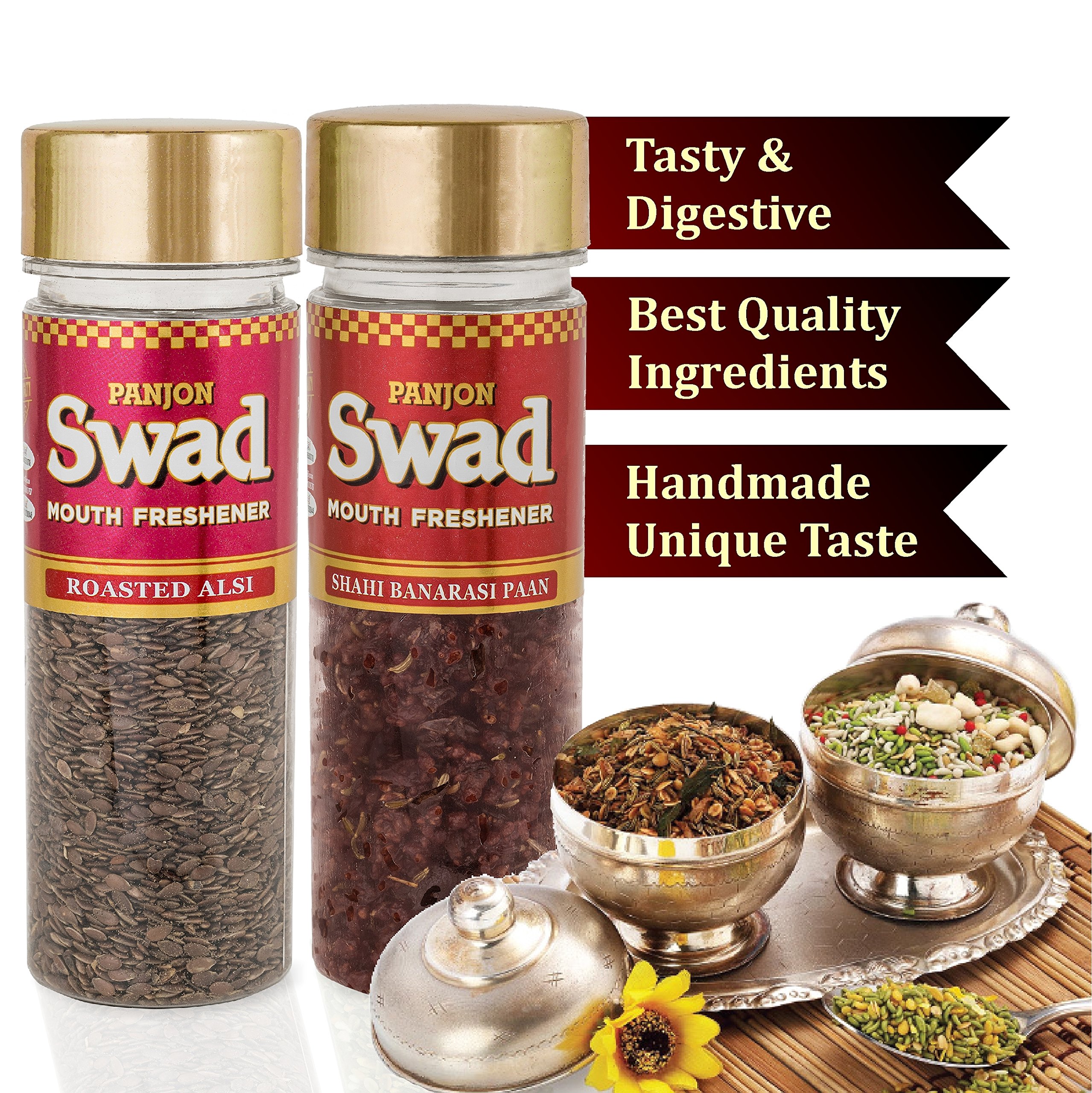 • 100% NATURAL MOUTH FRESHENERS: Infused with the goodness of Hand Picked fruits & ingredients Swad Pachak Mukhwas are best for Digestion & help in stomach health. Signature taste relished by all age groups. Panjon Swad Banarasi Paan & Roasted Alsi Flax See