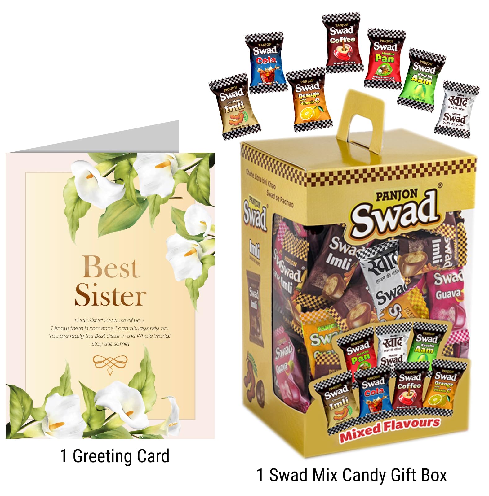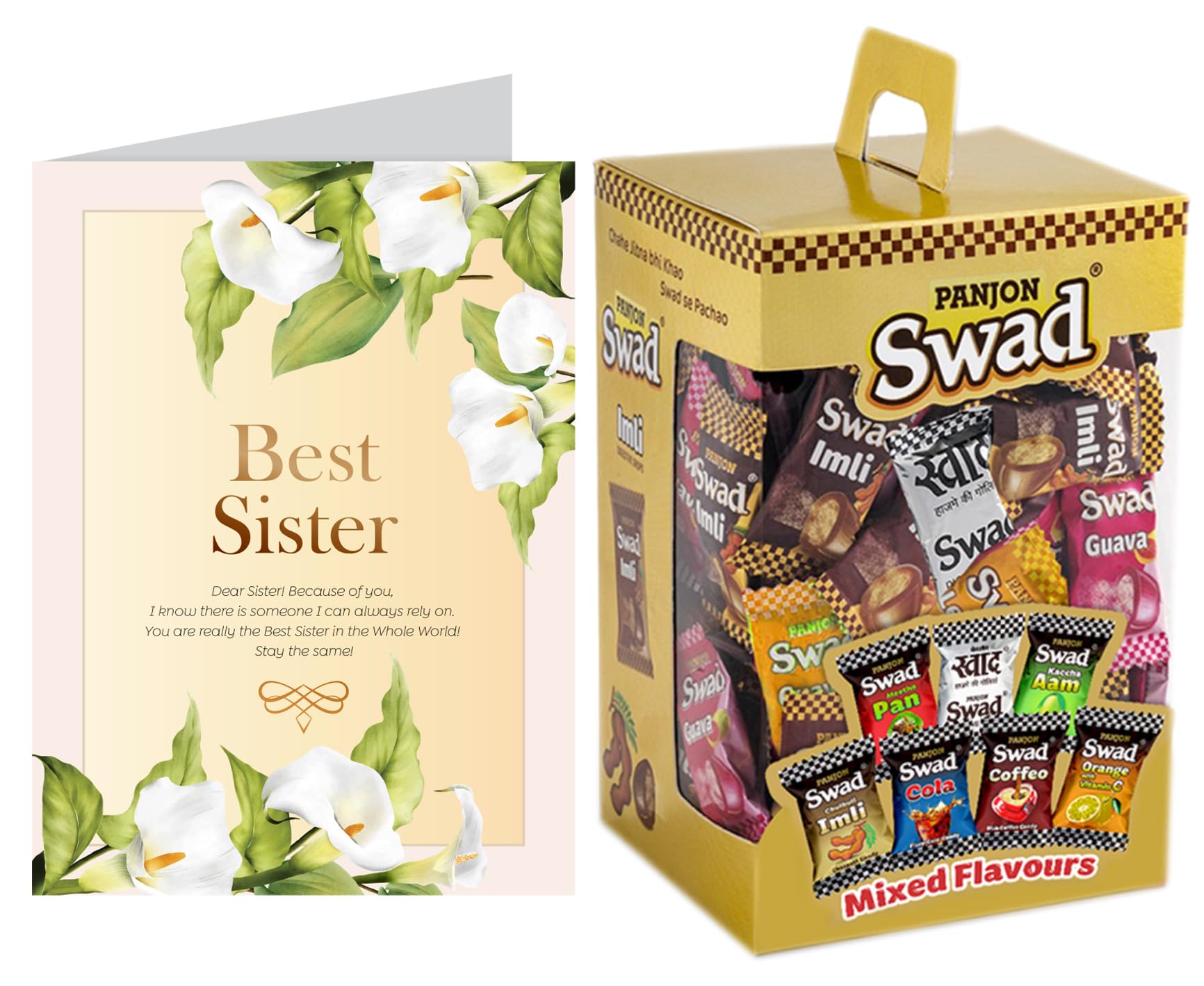 Best Gift for Best Sister with card in chocolate hamper set Swad Trust Since 1986: India's favourite Digestive confectionery candy brand since 1986. A quality product by Panjon Limited. Swad Digestiveed Candy Jar is made of assorter fruit chewy candy flavours: Kaccha Aam Meetha Pan Imli Cola Coffee & Orange with Vitamin C chocolates Digestive. Swad Candies helps in digestion & acidity. Its signature taste is relished by all age groups. Try all Swad Mouth fresheners: Mukhwas Paan Anardana Imli Khajoor Amla Aam Papad Saunf & Navratan Digestive. with Card hamper gifts best unique for greeting message customised customized personalised personalized candy toffee candi chocolate hamper boxSwad Trust Since 1986: India's favourite Digestive confectionery candy brand since 1986. A quality product by Panjon Limited.Swad Digestiveed Candy Jar is made of assorter fruit chewy candy flavours: Kaccha Aam Meetha Pan Imli Cola Coffee & Orange with Vitamin C chocolates Digestive.Swad Candies helps in digestion & acidity. Its signature taste is relished by all age groups.Try all Swad Mouth fresheners: Mukhwas Paan Anardana Imli Khajoor Amla Aam Papad Saunf & Navratan Digestive.