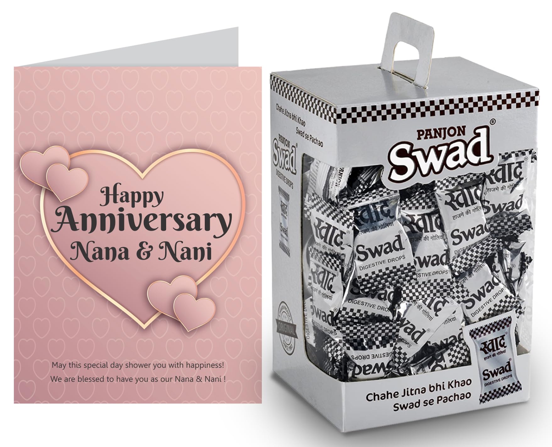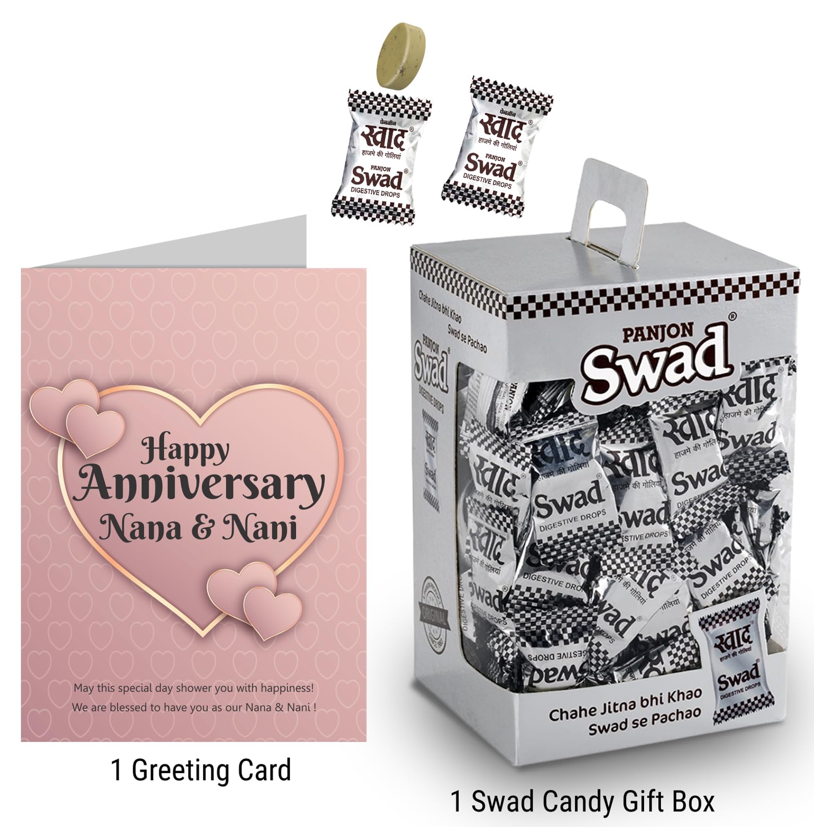 Swad Happy Anniversary Nana & Nani Gift with Card (Swad Digestiveed Flavours Candy 125 Box & 1 Greeting card) 2 units Happy Anniversary Nana & Nani Gift with Card hamper gifts best unique for greeting message customised customized personalised personalized candy toffee candi chocolate hamper boxSwad Trust Since 1986: India's favourite Digestive confectionery candy brand since 1986. A quality product by Panjon Limited.Swad Digestiveed Candy Jar is made of assorter fruit chewy candy flavours: Kaccha Aam Meetha Pan Imli Cola Coffee & Orange with Vitamin C chocolates Digestive.Swad Candies helps in digestion & acidity. Its signature taste is relished by all age groups.Try all Swad Mouth fresheners: Mukhwas Paan Anardana Imli Khajoor Amla Aam Papad Saunf & Navratan Digestive.