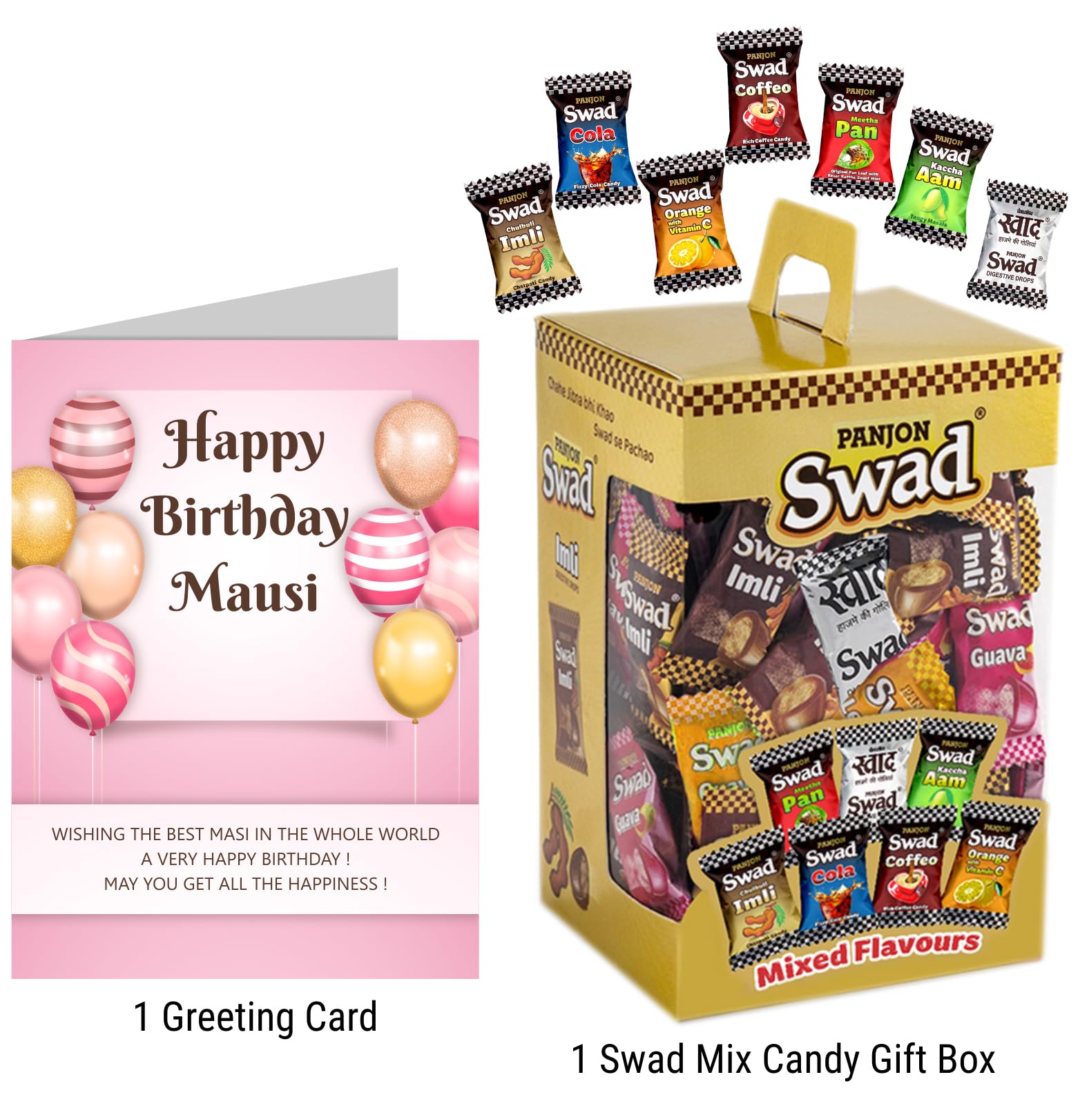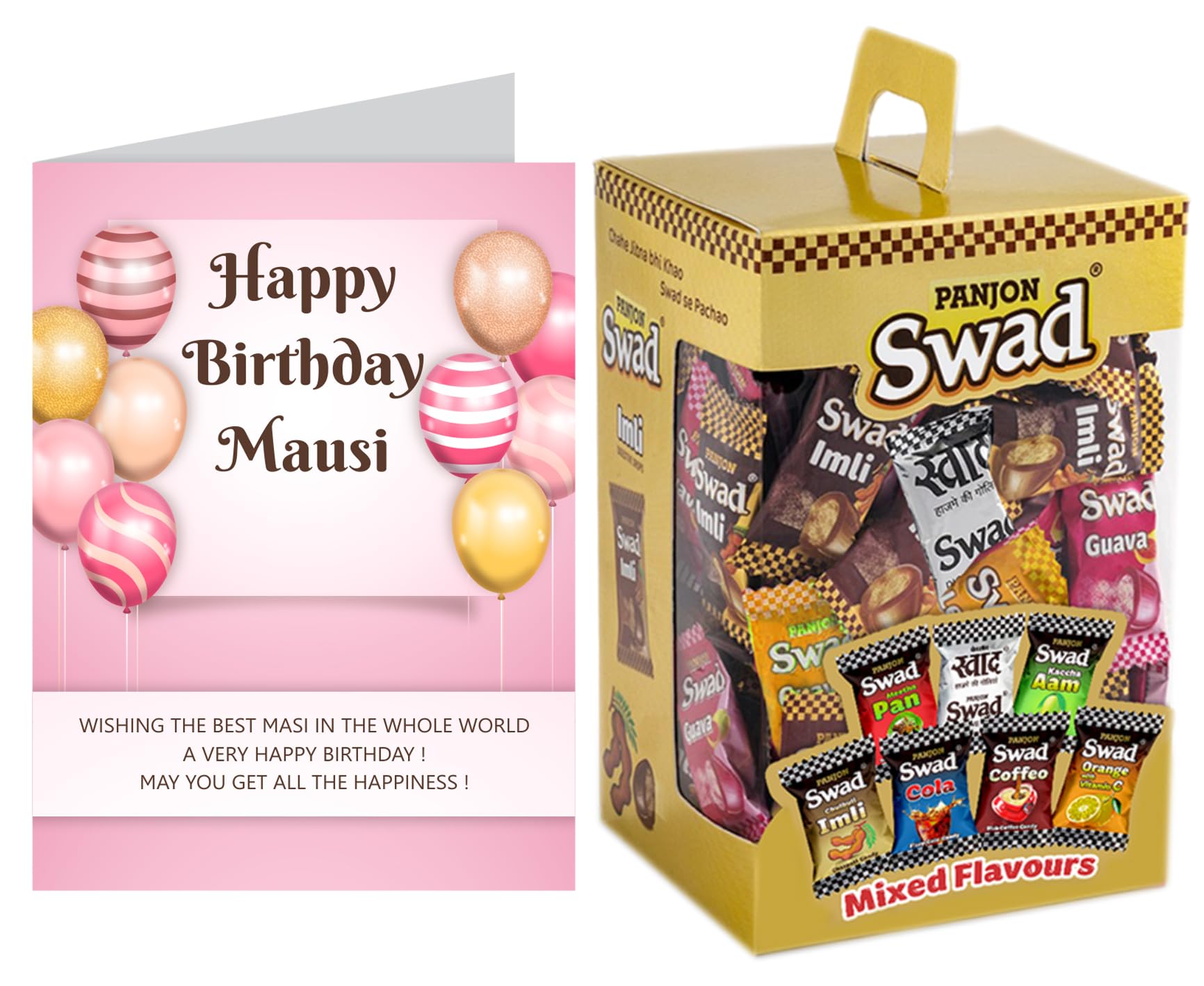 Swad Happy Birthday Masi/Mausi Gift with Card (Swad Mix Candy 125 Gift Box & 1 Greeting card) 2 units
