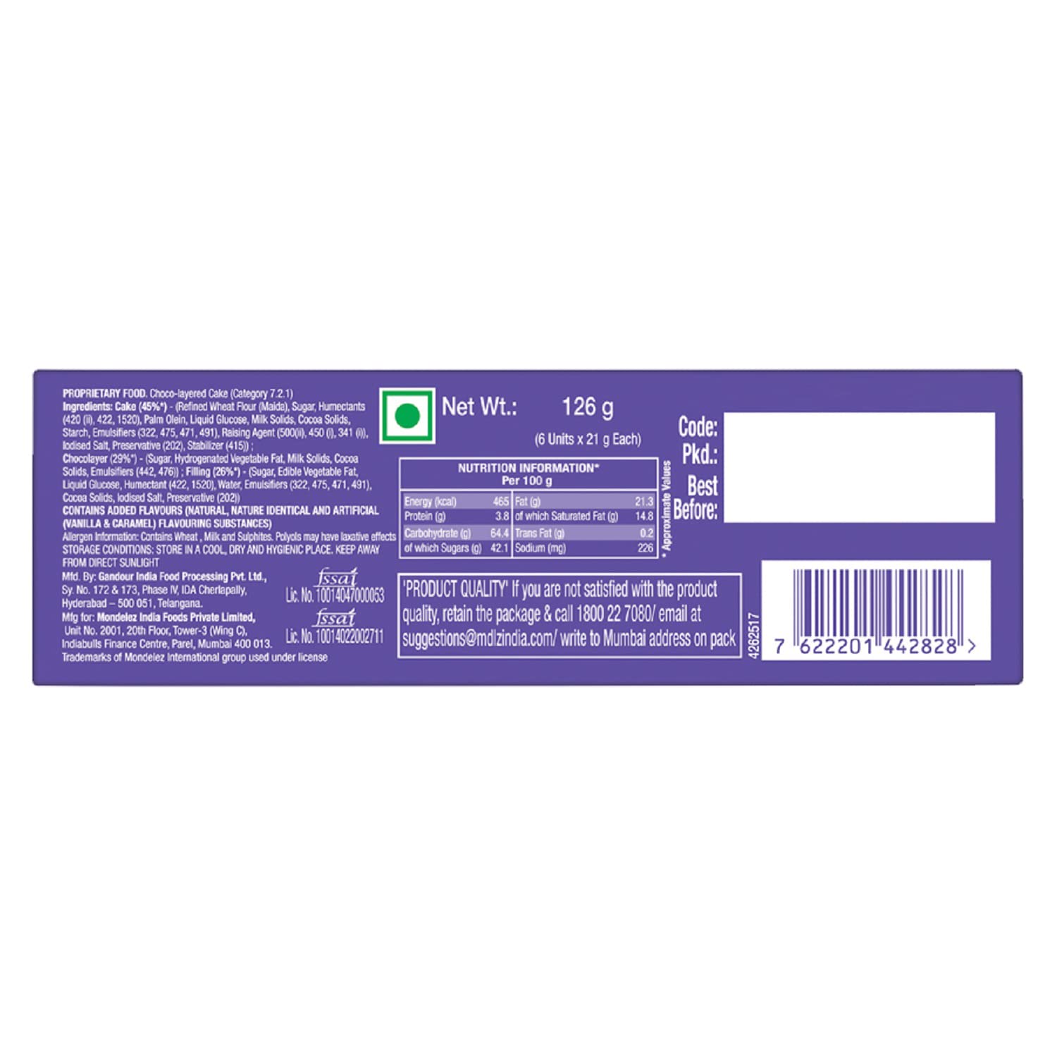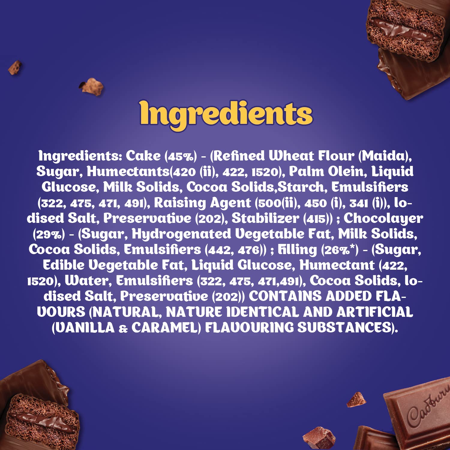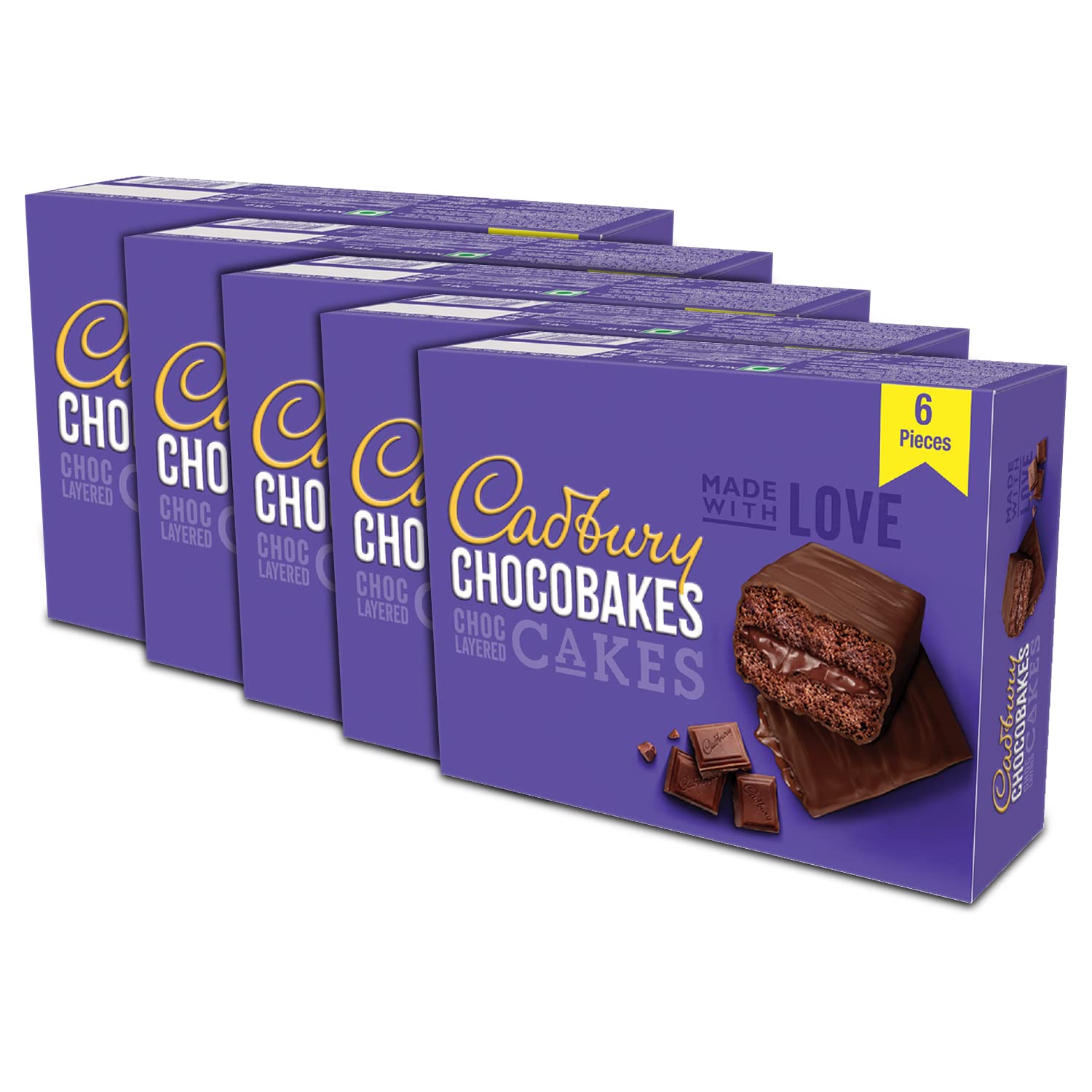 Experience the new exciting Cadbury chocolate choc layered cake. Indulge in the delightfully light sponge cake enrobed in a chocolatey coating outside and layered with chocolatey cream inside. Perfect as an indulgent "me time" Treat or to relish happy moments with your loved ones and friends. This pack contains 5 units of Cadbury Chocobakes Choc Layered Cakes Family Pack 126g