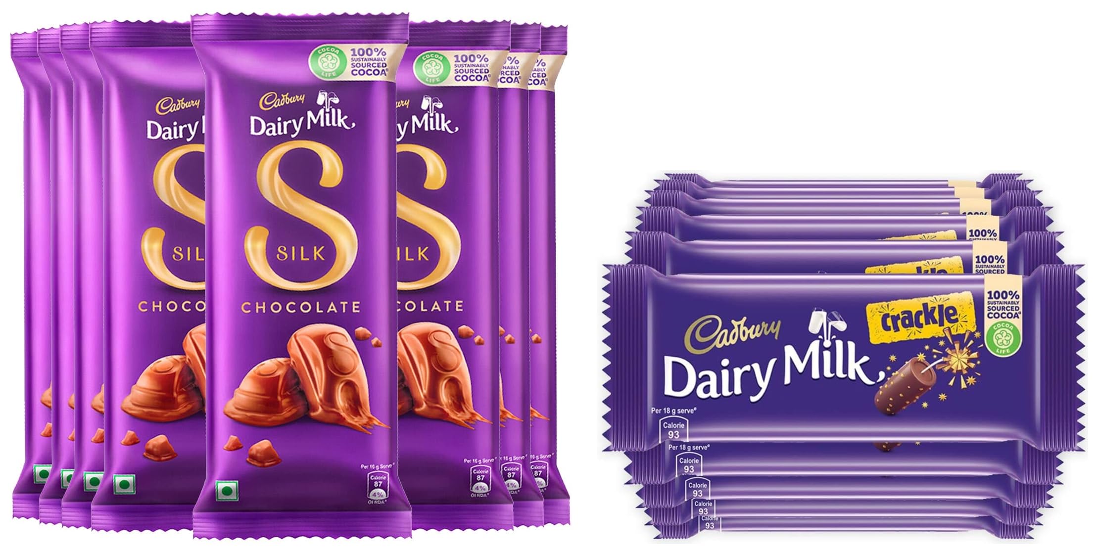 Cadbury Dairy Milk Silk Chocolate Bar 60g (Pack of 8)Cadbury Dairy Milk Silk is all about regaling in the chocolate's richness and creaminess. The classic taste of Cadbury chocolates offers you the reason to celebrate every small and big occasion of happiness. In short Indulge in the premium chocolate delicacy. This Pack Contains Cadbury Dairy Milk Silk Chocolate Bar 60g (Pack of 8).Cadbury Dairy Milk Crackle Chocolate Bar Pack of 10 x 36 gKuch achha ho jaaye kuch meetha ho jaaye with Cadbury Dairy Milk. Generously made with a glass and half of milk Cadbury Dairy Milk Crackle also has crunchy rice crispies. Cadbury Dairy Milk is the perfect meetha for sharing everyday moments of joy with your loved ones. This pack includes 10 packs of 36g Cadbury Dairy Milk Crackle Chocolate. This milk chocolate bar is perfect for snacking & storing in the fridge or for gifting & sharing on special occasions like birthdays and get-togethers. Every bar of Cadbury Dairy Milk is made from 100% sustainable cocoa. It is suitable for vegetarians.