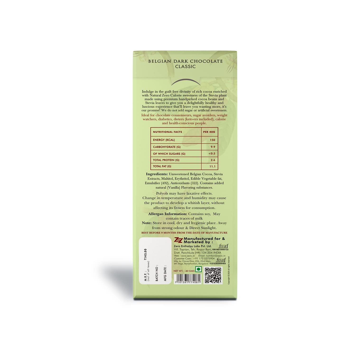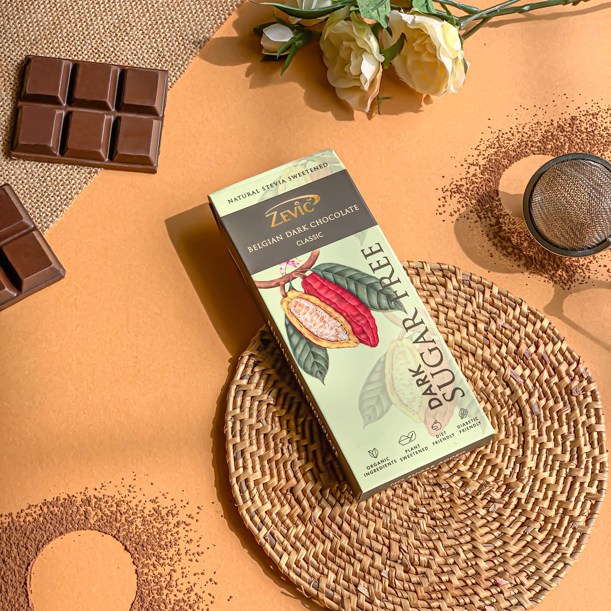 ZEVIC Dark Chocolate Sugar Free | Classic Cocoa Belgian Dark Chocolate Bar | Natural Stevia Chocolate | Diabetic Friendly Chocolate | Diet Keto Chocolate | Vegan Healthy Chocolate 40g (Pack of 1)