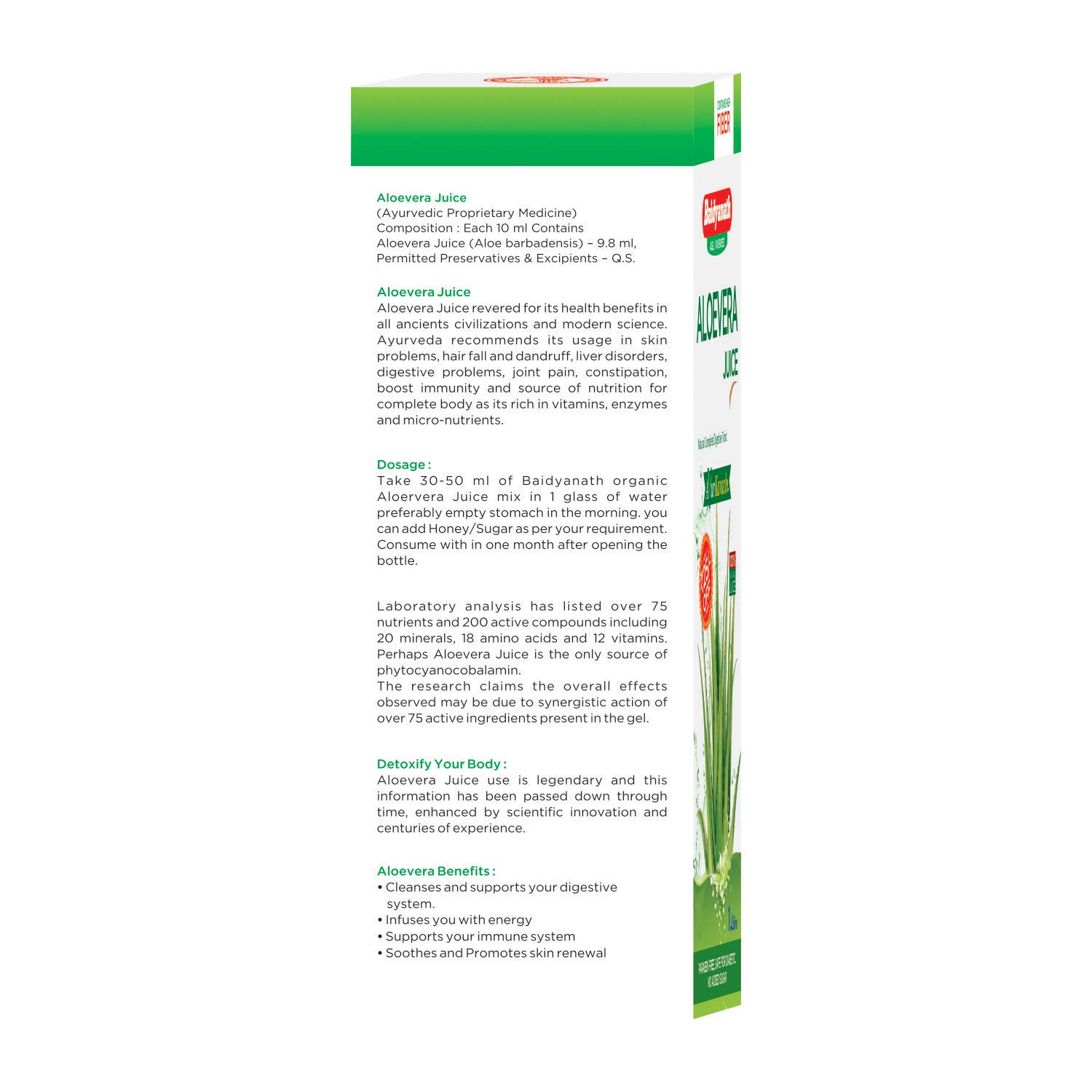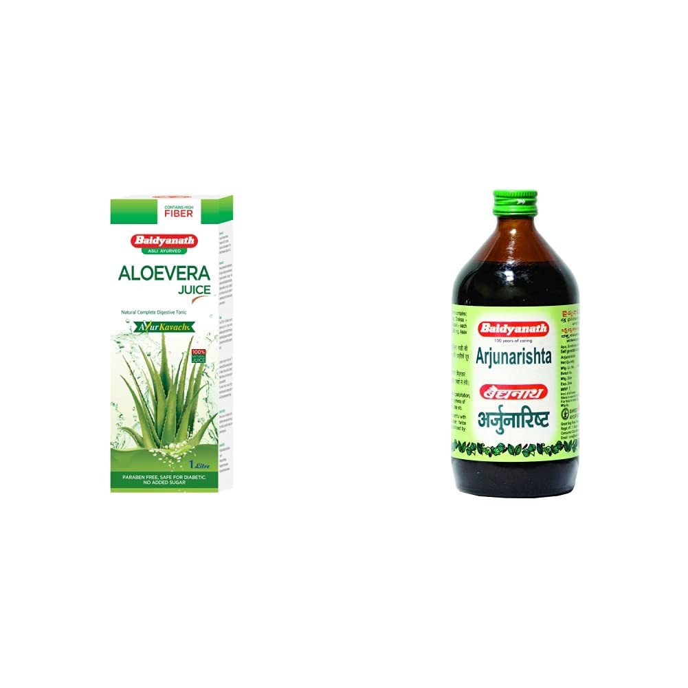 Baidyanath Aloe Vera juice with Pulp All Natural tonic for Immunity Better digestion and Glowing Skin 1000 mlBaidyanath Aloe Vera Juice with pulp condenses the magical benefits of this herb into a healthy herbal and wholesome drink. It boosts immunity builds a healthy digestive system and gives relief from constipation. Reduces fat and tones your body. It protects your liver. Alleviates skin allergies.Baidyanath Aloe Vera Juice is 100% pure natural & fre from any synthetic flavor & color. It contains several vitamins and minerals that your body needs for its good nutrition.Baidyanath Arjunarishta Natural Arjuna tvak Draksa Madhuka Dhataki GUdaAsav Base 680 ml TonicPack of 1Arjunarishta is the multiherb restorative tonic to manage cardiac function naturally with the clinically proven herb Arjuna (Terminalia arjuna). Arjuna lowers cholesterol level in the body. Arjuna allays the symptoms of palpitation excessive sweating restlessness etc.