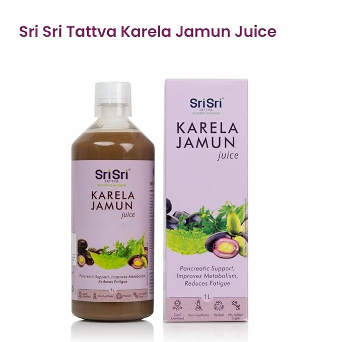HomeHealth & PersonalDiet & NutritionHealth DrinksSri Sri Tattva Karela Jamun Juice | Maintains Blood Sugar Levels | Reduces Bad Cholesterol | Good for Digestive Health | No Added Sugar | 1 litre I Pack of 2