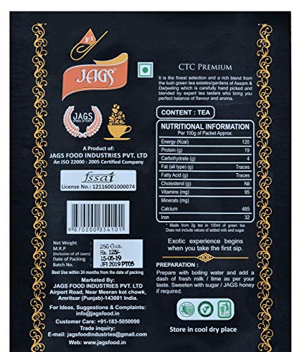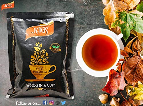 JAGS CTC TEA A HUG IN A CUP INTRODUCTION JAGS CTC Tea is a Single Estate Garden means the tea is collected from a single estate garden. Crush tear curl is a method of processing CTC Tea in which the leaves are passed through a series of cylindrical rollers with hundreds of sharp teeth that crush tear and curl the tea into small hard pellets. ... Tea produced using this method is generally called CTC tea. Used to brew black tea without milk milk tea and masala chai in India. Qualities of JAGS CTC Tea The bold flavours of JAGS CTC tea make them ideal for pairing with Western foods. Mostly its best for afternoon tea are black teas as are most teas consumed with breakfast foods. CTC tea may also pair well with some Indian Thai and African foods. PREPARATION of JAGS CTC Tea- Prepare with boiling water & add a dash of milk or lime as per your choice. Its the finest selection and a rich blend from the lush green tea estates/gardens of Assam &Darjeeling which is carefully hand picked and blended by expert tea tasters who bring you perfect balance of flavour and aroma.