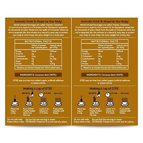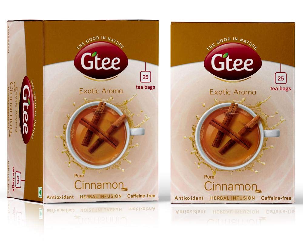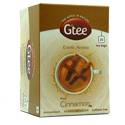 GTEE® CINNAMONGtee Cinnamon Herbal Infusion contains Original 100% Ceylon Cinnamon Bark. With an Exotic Aroma this spicy revitalizer is a natural and tasty way to protect your body and mind. Cinnamon bark supports weight loss and reduces sugar level. Enjoy this spicy delight for a lively day!GTEE® THE GOOD IN NATUREAt Gtee we believe that goodness should be inherent. That when it inhabits the very roots of our organisation nurtured by our people and our processes the result will always be something to be proud of. Goodness is in humility; the will to always learn adapt and grow in the virtue of integrity; honesty in everything we do and in being uncompromising in whatever we give to you. Why do we do it? Well it comes naturally to us. Exquisite teas from INDIA.
