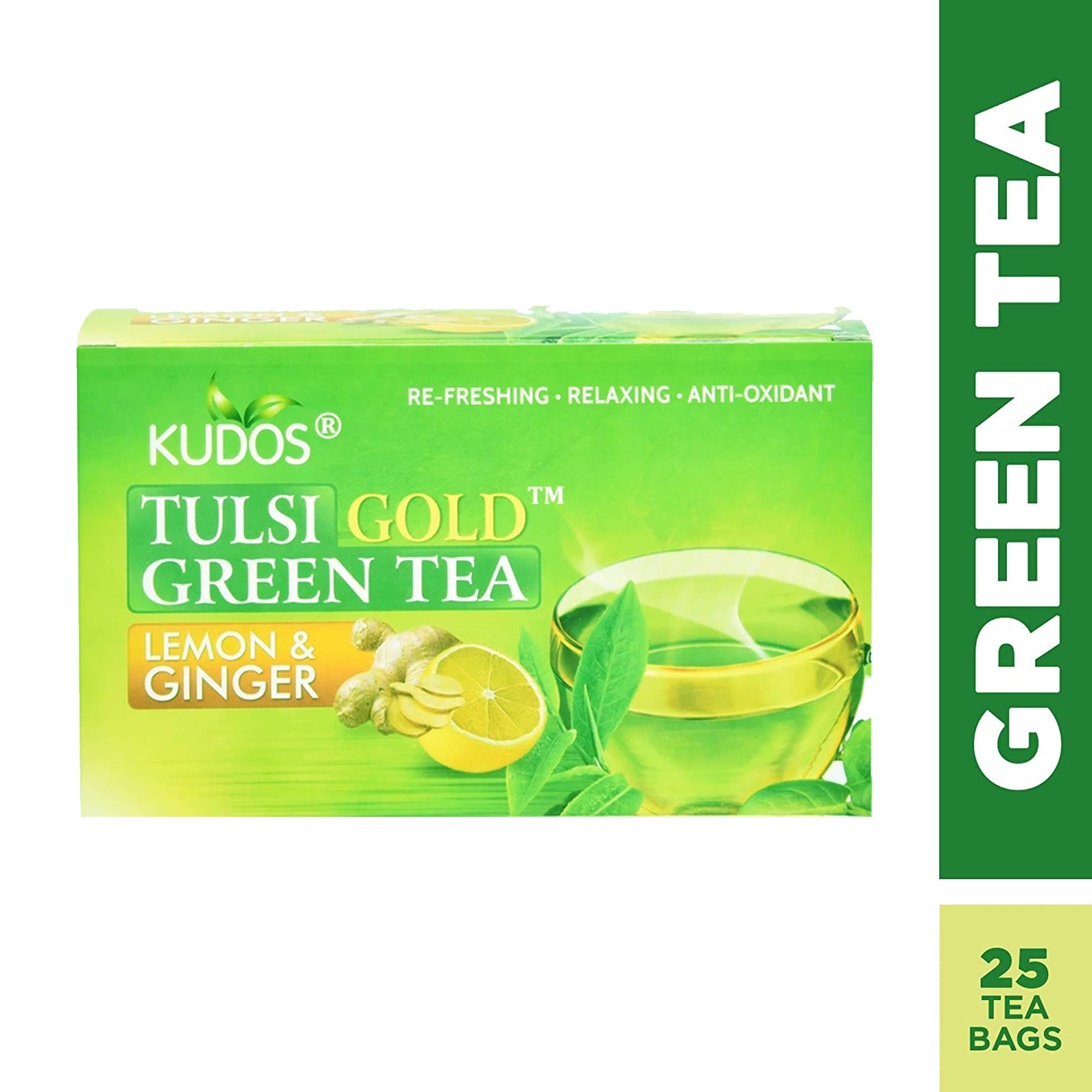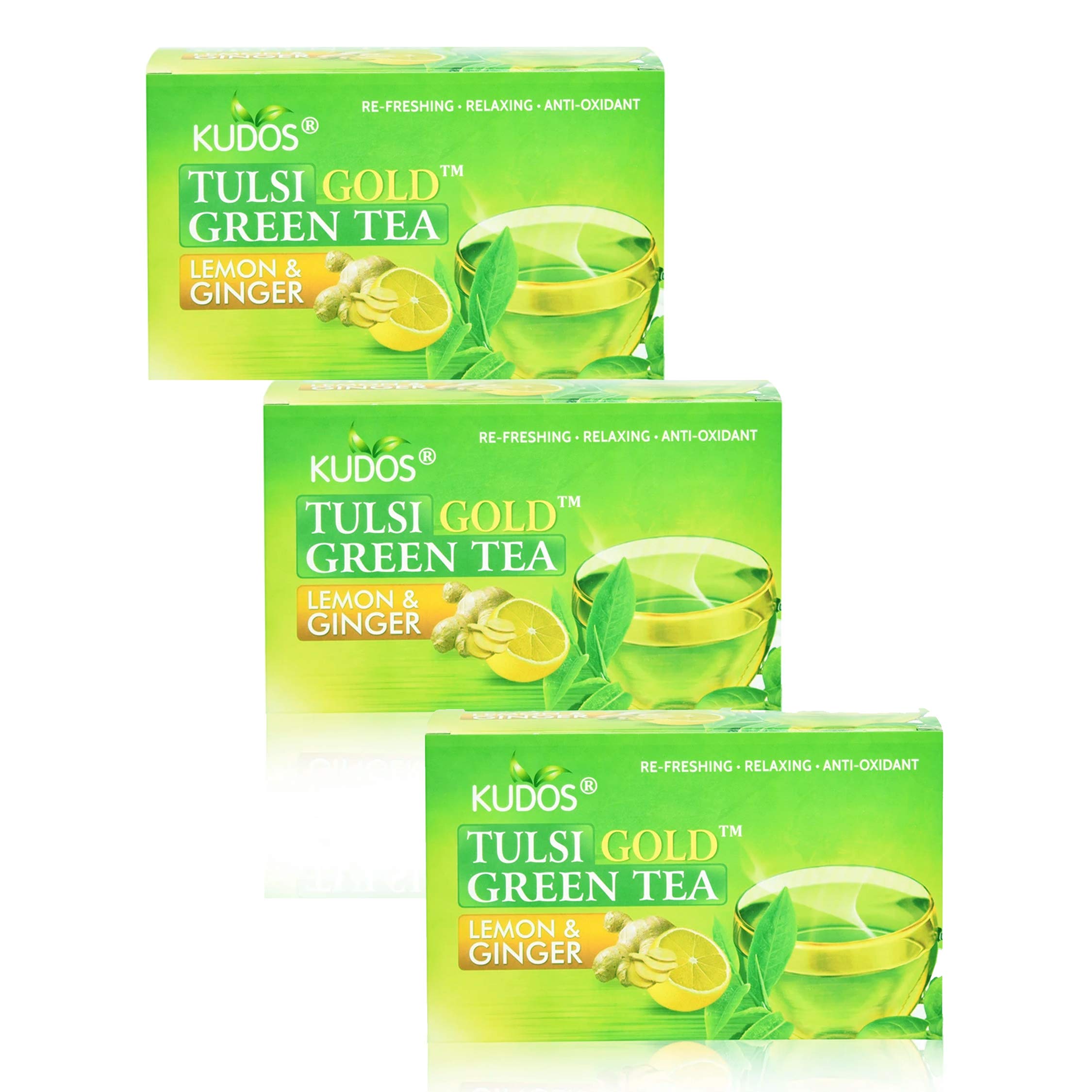 KUDOS TULSI GOLD GREEN TEA - LEMON & GINGER - 50GM - (PACK OF 3)