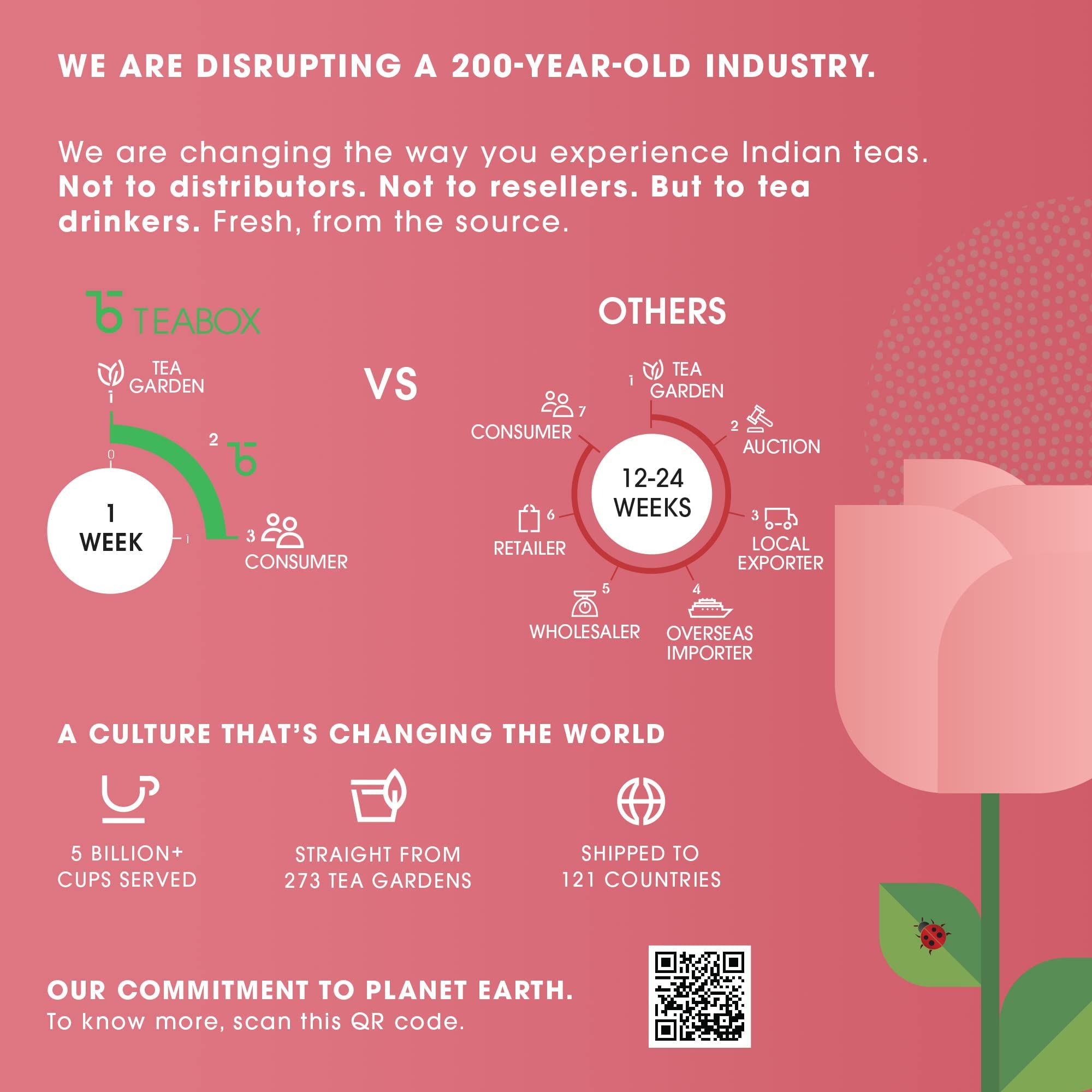 FROM THE SOURCE Teabox sources 100% fresh tea directly from over 273 Indian tea gardens in less than 1 week.
