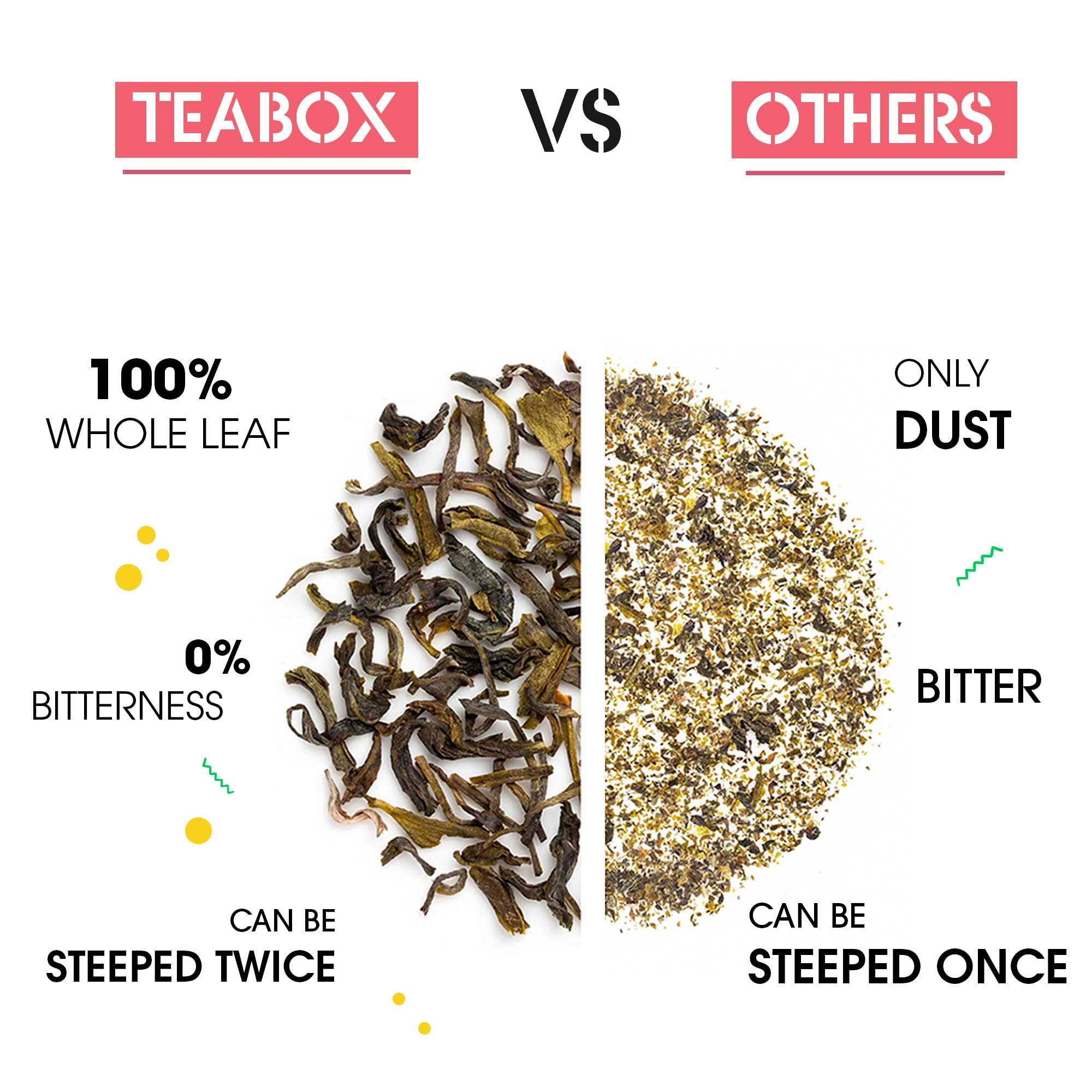 ABOUT Teabox Teabox offers whole leaf green teas without dust or fannings and is blended with 100% natural ingredients for a smoother green tea experience with no bitterness