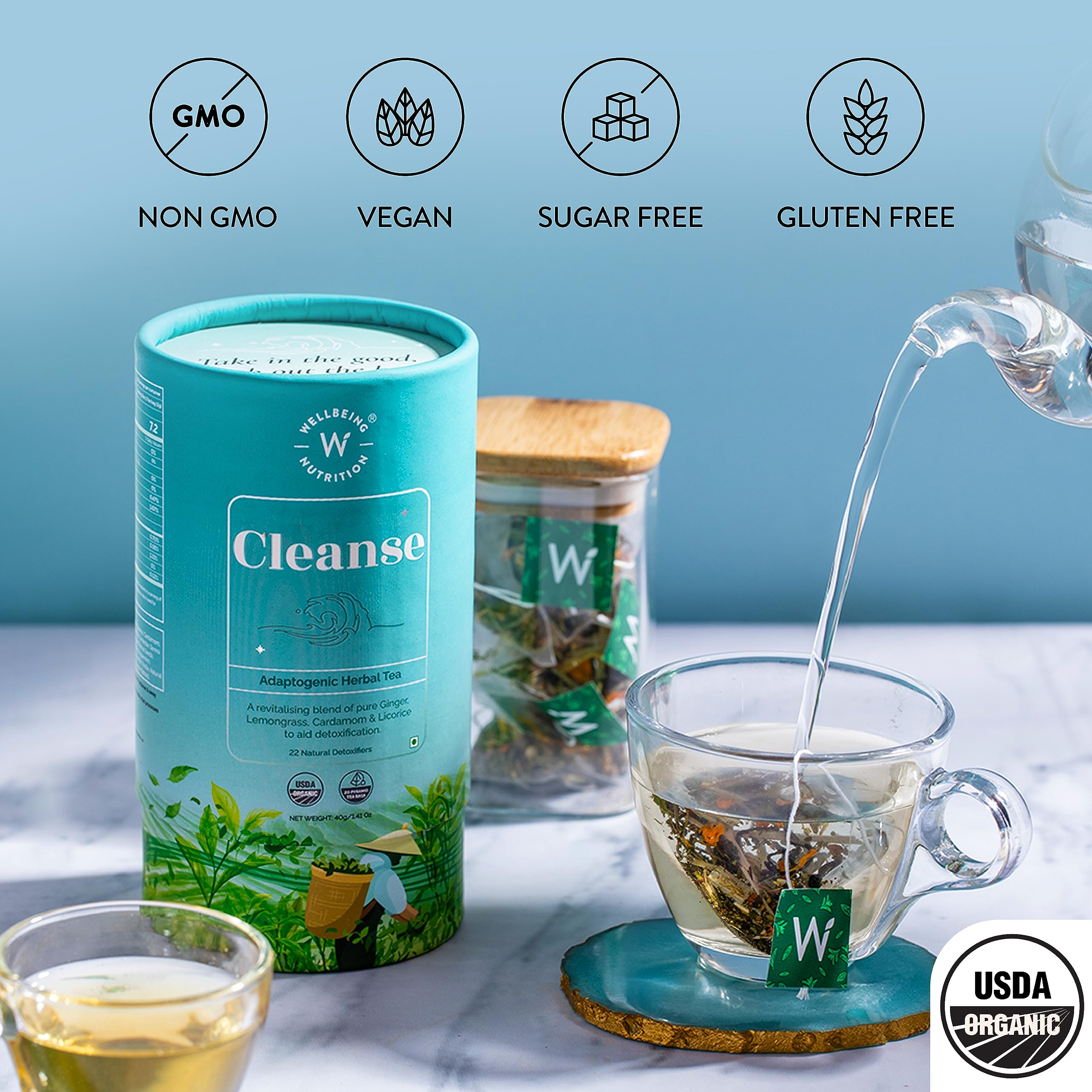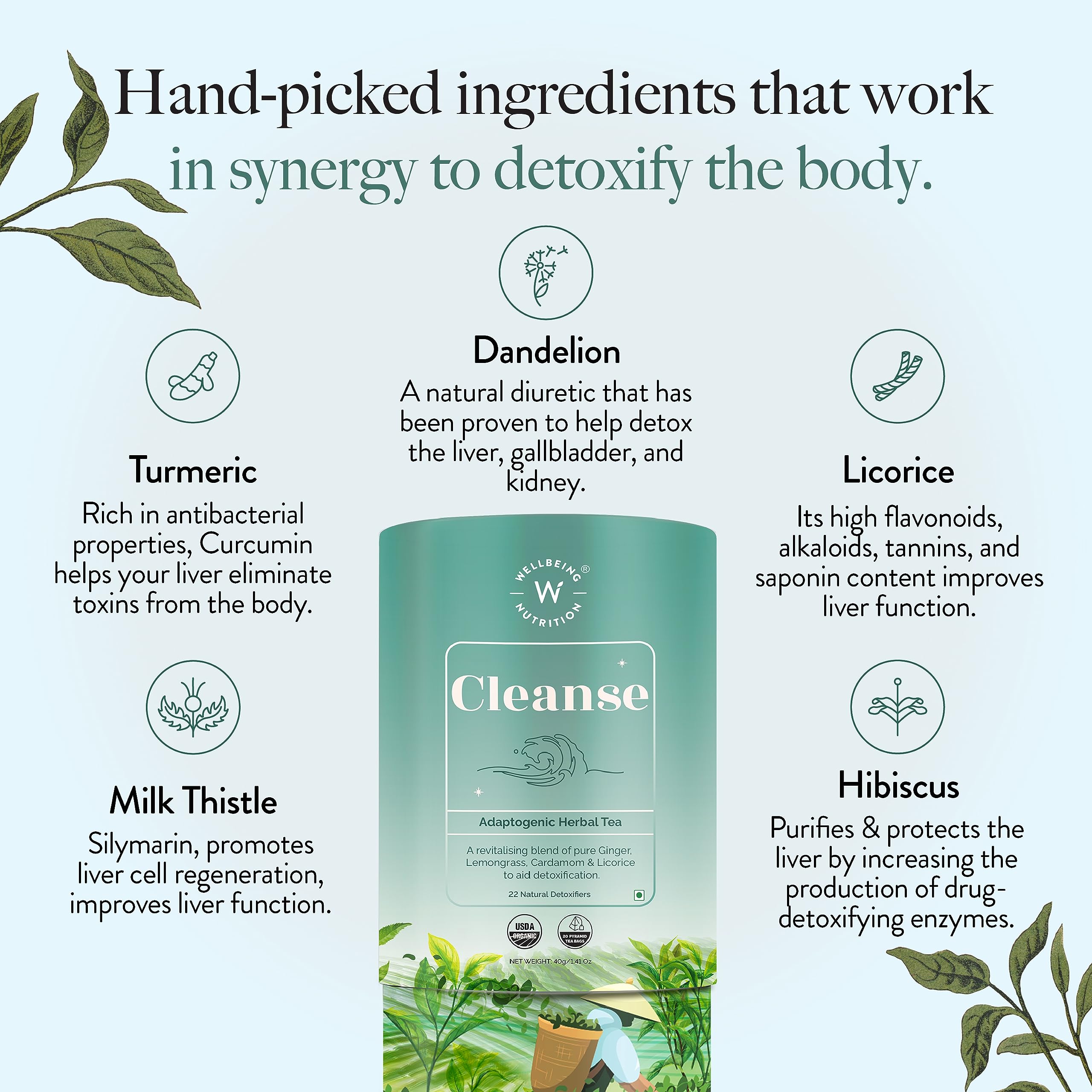 • A COMPLETE DETOX: Transition to a cleaner self with Wellbeing Nutrition's Cleanse Tea. A cup of this hepatoprotective tea is absolutely free of caffeine and has the world's finest detoxifying herbal ingredients. Feel the purity and richness of organically