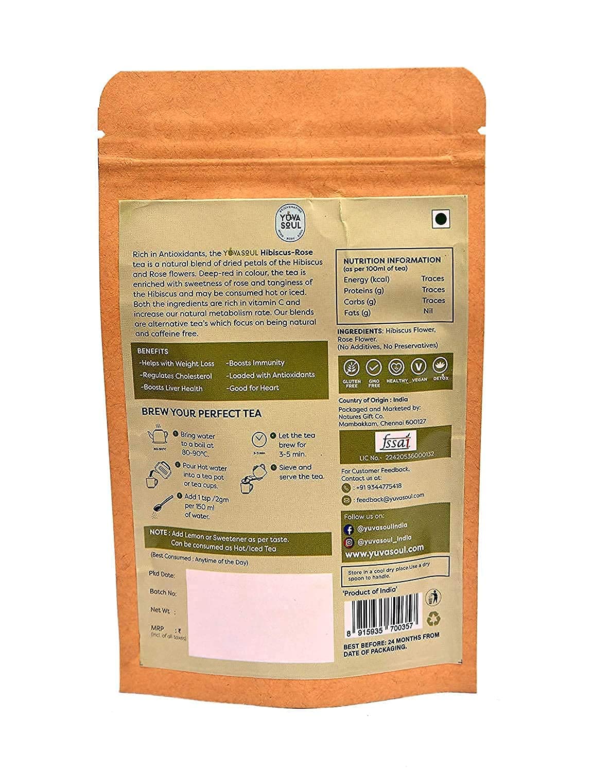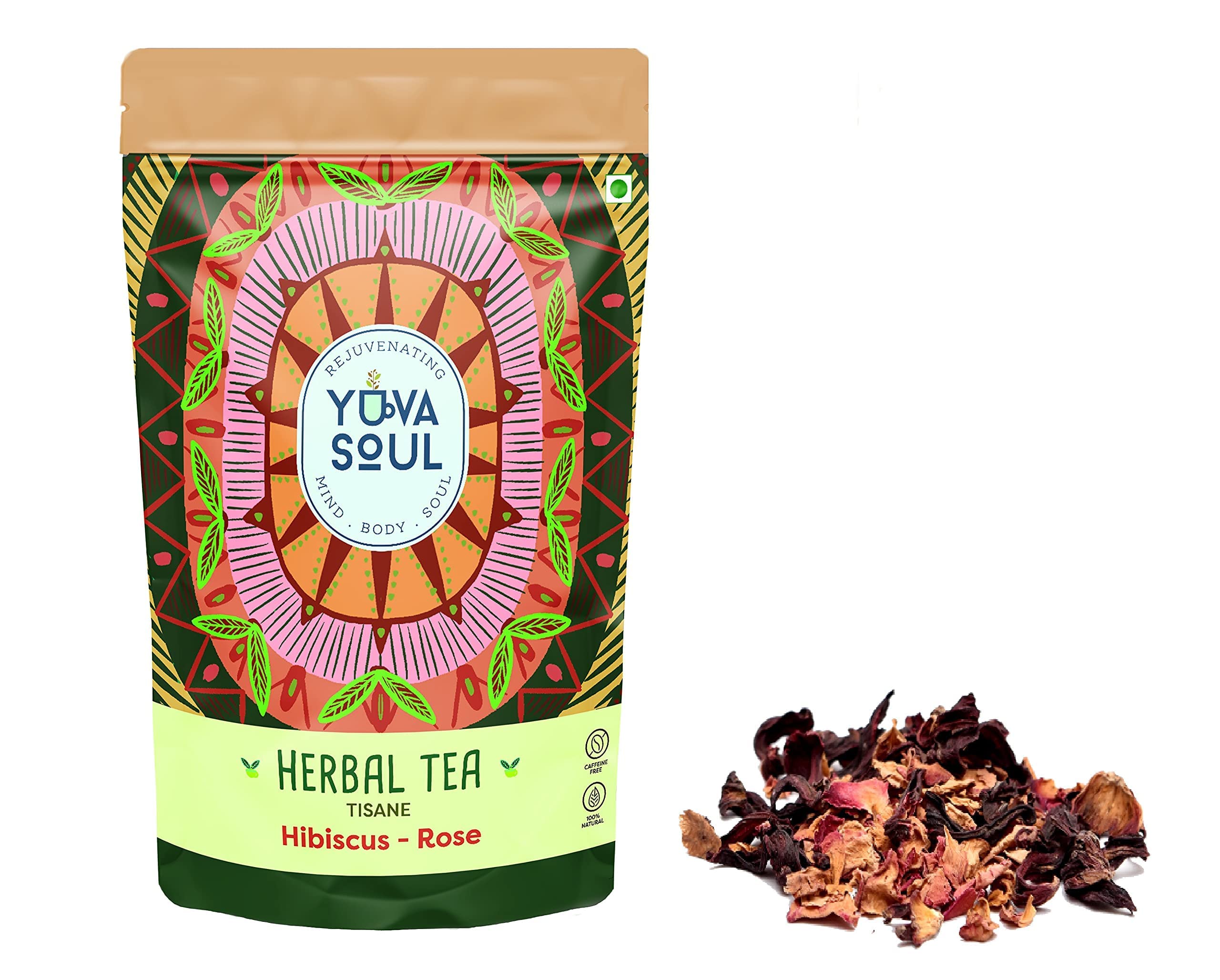 The oxidant rich Hibiscus Rose tea by Yuva Soul is a delicious infusion of dried petals of the hibiscus and the rose flower. The sweetness of the rose and tanginess of the hibiscus gives the tea a deep-red colour. This soothing combination of Rose and Hibiscus is rich in vitamin C that helps the skin detox and also boosts metabolism. Also the flavourful hibiscus-rose tea can be consumed hot or as an iced tea based on ones preference.
