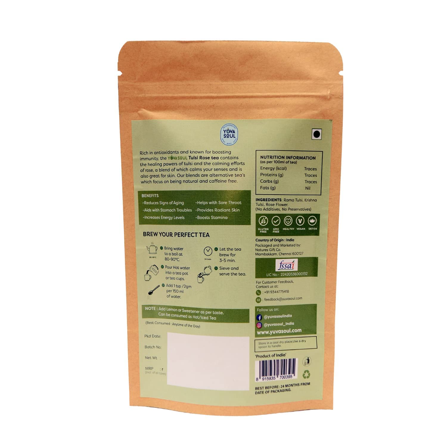 Known for its immunity boosting properties the Yuva Soul Tulsi Rose tea is rich in antioxidants and increases energy levels. Used as the prime herb since ancient ayurveda for its healing properties Tulsi leaves infuses the tea with its antibacterial properties that soothes a sore throat. Whereas the blend of rose in the tea has a calming effect on the mind and body and also results in radiant skin.