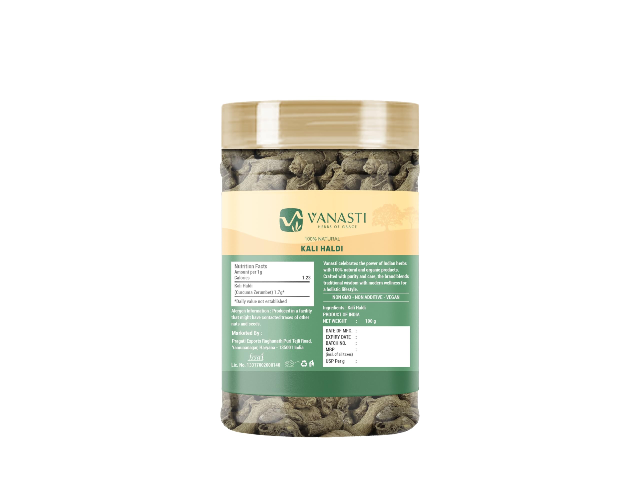 Kali Haldi (Black Turmeric, Curcuma caesia) is a rhizome with a dark bluish-black interior and an earthy, slightly bitter flavor. Native to India, it belongs to the ginger family. Kali Haldi contains natural plant compounds such as curcuminoids and essential oils. It is sometimes used as a spice or coloring agent in culinary preparations and is valued for its unique color and aroma.