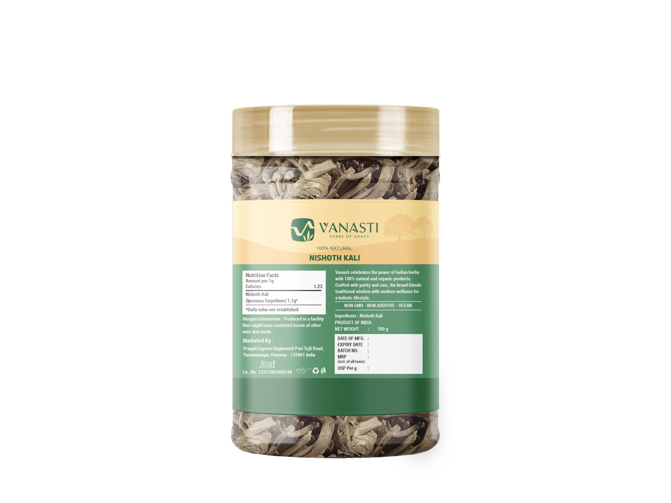 Nishoth Kali (Nishod Kali, Nishaut Kali, Ipomoea turpethum, Indian Jalap) is a perennial climbing plant native to India and other parts of Asia. It features twining stems, heart-shaped leaves, and funnel-shaped flowers, with fleshy, tuberous roots that are commonly used in traditional Ayurvedic preparations. Nishoth Kali root is known for its natural plant compounds and is often included in classic herbal blends and formulations. The roots are typically used in powdered or decoction form as part of traditional wellness and culinary practices.