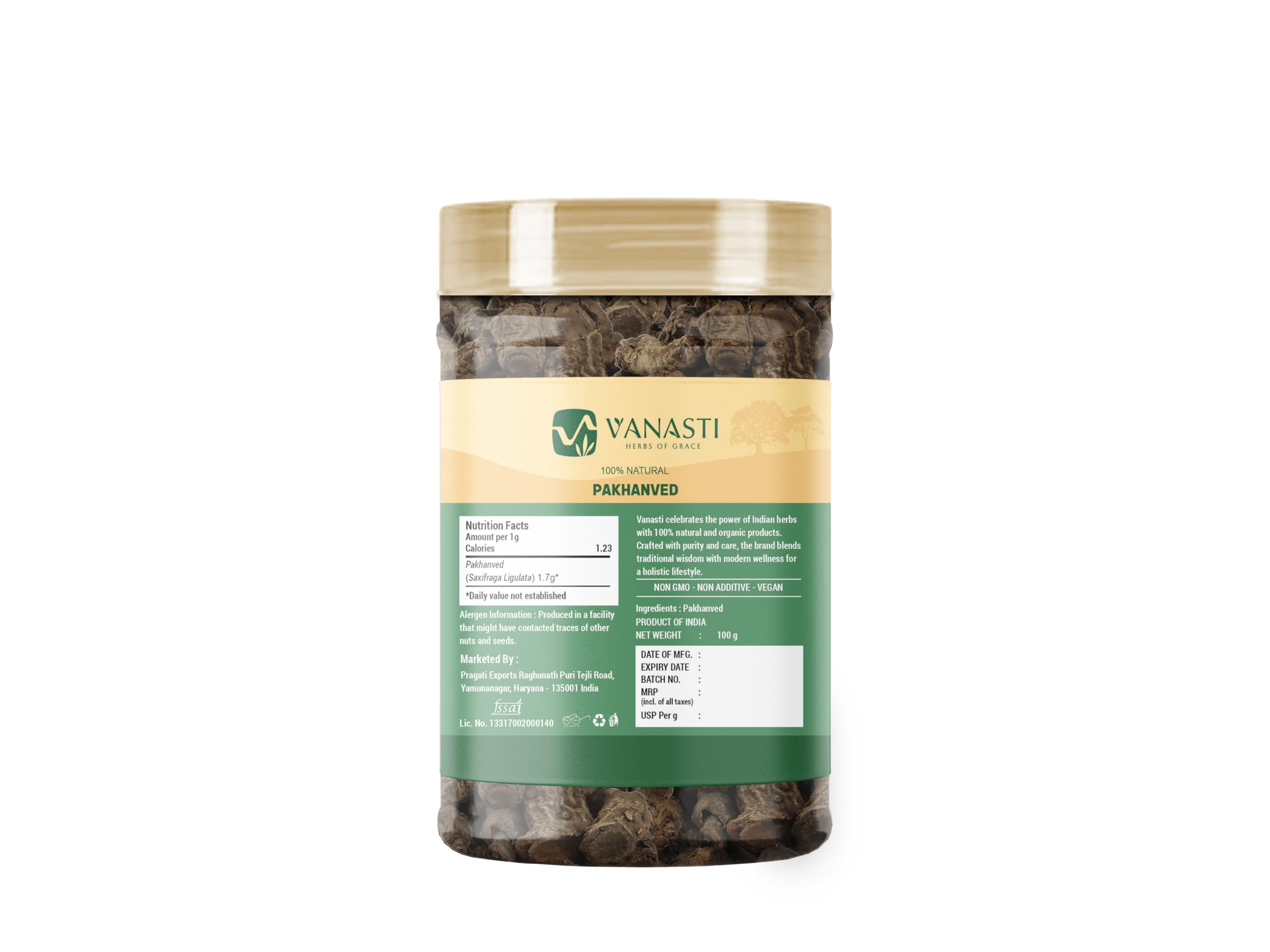 Pakhanved (also known as Pashan bed, Pakhanbed, Patharchatta Root, Saxifraga ligulata) is a perennial herb native to the Himalayan region and other mountainous areas of India and Asia. The plant features fleshy leaves, stout creeping rootstock, and small white, pink, or purple flowers. Its roots and rhizomes are traditionally used in Ayurveda, especially for preparing herbal powders and decoctions. Pakhanved is valued for its astringent and cooling properties, and is commonly included in classic herbal blends and traditional preparations for both internal and topical use.