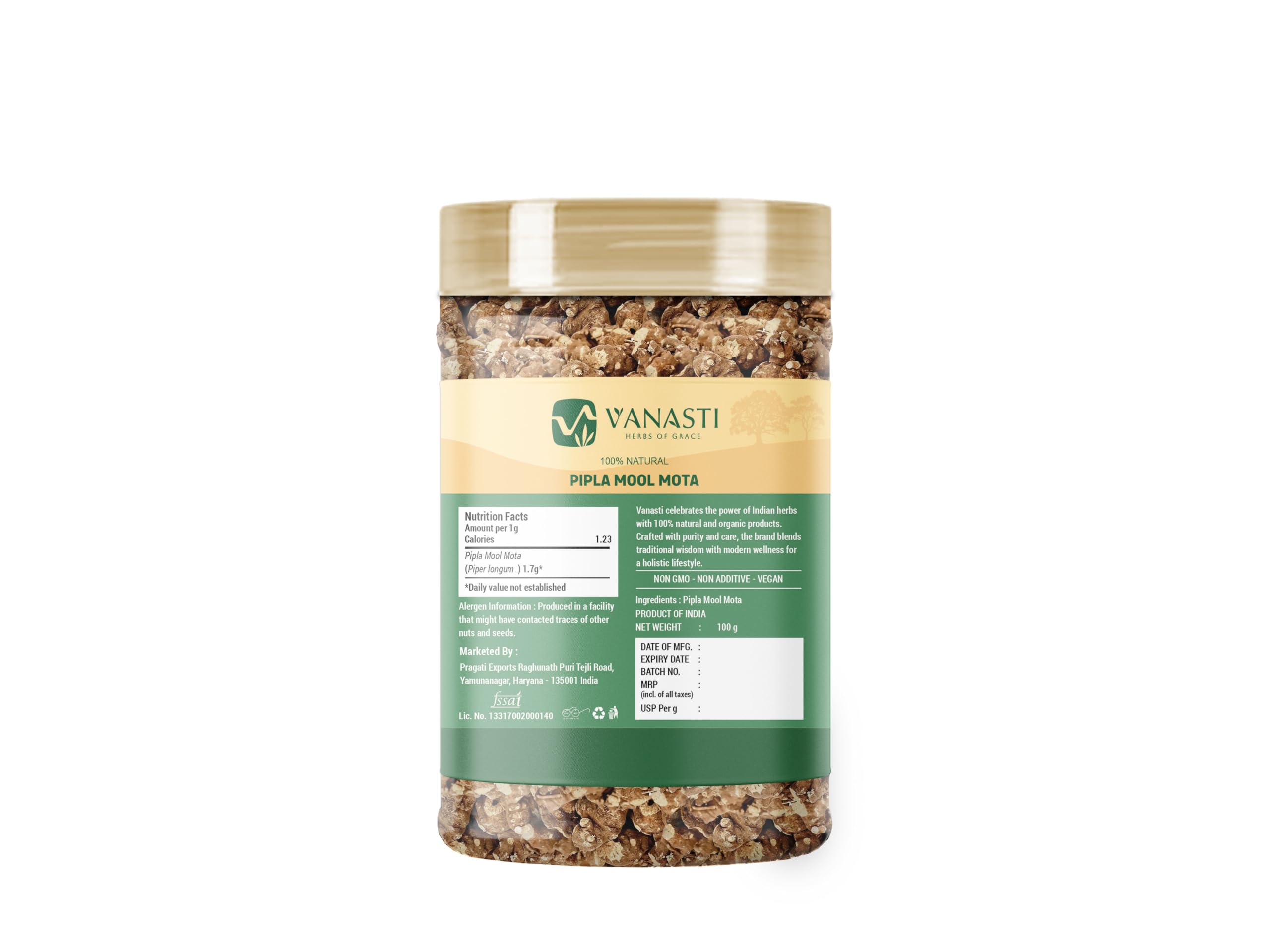 Pipla Mool Mota (also called Piplamool Mota or Peepla Mool) comes from the thick root of the Piper longum plant. This spice is valued in traditional cuisines for its strong aroma and unique flavor. Native to parts of Asia, it is often used to add depth to various dishes. Nutritionally, it provides small amounts of certain vitamins and minerals, such as vitamin C, iron, and calcium, common in many plant roots.