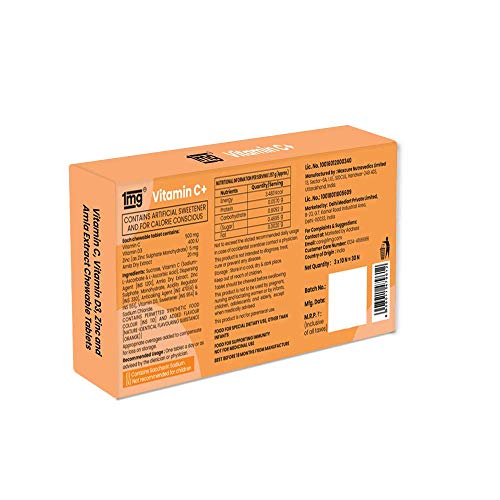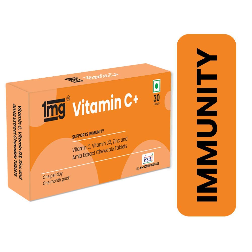 1mg Vitamin C+ Chewable Tablet provides the goodness of amla vitamin C vitamin D3 and zinc. Vitamin C has several important functions. It is known to protect cells and keep them healthy. Vitamin C also helps in wound healing and maintains healthy skin. Additionally zinc helps with metabolism function and Vitamin D3 helps in the absorption of calcium and phosphorus. All these benefits come in easy-to-consume chewable Tabs..Key Ingredients:Vitamin CVitamin D3ZincAmla ExtractKey Benefits:It helps maintain healthy skinIt boosts the immunityIt protects the body against infectionsZinc helps the immune system and metabolism functionVitamin D3 helps in the absorption of calcium and phosphorusAmla improves the immune function reduces the effects of premature ageingDirections For Use:It is recommended to take one tablet a day or as advised by the dietician or physician.Safety Information:Read the label carefully before useStore in a cool and dry place away from direct sunlightKeep out of reach of the childrenContains saccharin sodiumNot recommended for childrenNot to exceed the stated recommended daily usageIn case of accidental overdose contact a physicianThis product is not intended to diagnose treat cure or prevent any diseaseChew the tablet before swallowing