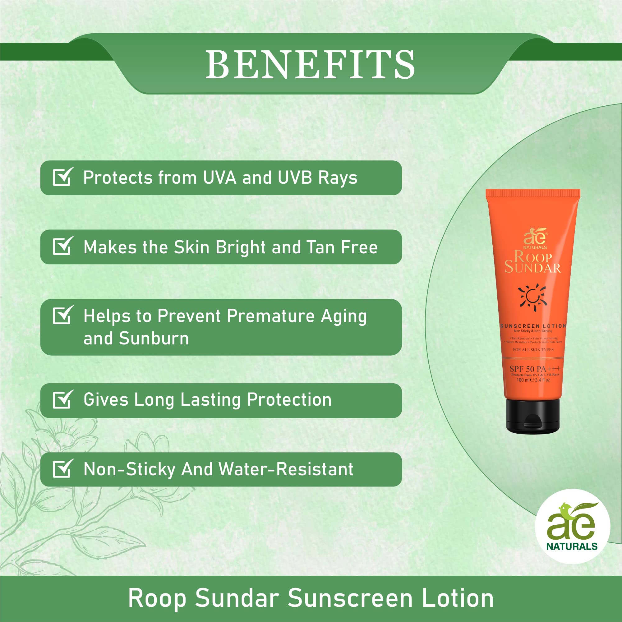 For Indian Skin: AE Naturals Roop Sundar Sunscreen Lotion is designed to cater to the unique needs of Indian skin tones. It easily gets absorbed into the skin and can be used under makeup without leaving any white cast. The superior matte finish gives you