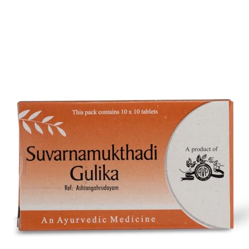 Suvarnamukthadi Gulika is a traditional ayurvedic medicine which is time tested formulation made with safe herbs and authentic ayurvedic products from the house of AVP. It is made of ayurvedic products Vacha kushta and Rudraksha which is effective in handling dysuria bloating and associated pain. Effective in the management of fever. Alleviates cough and dtspnoea and helps to sustain general well being. Beneficial in pyrexia and cephalgia.