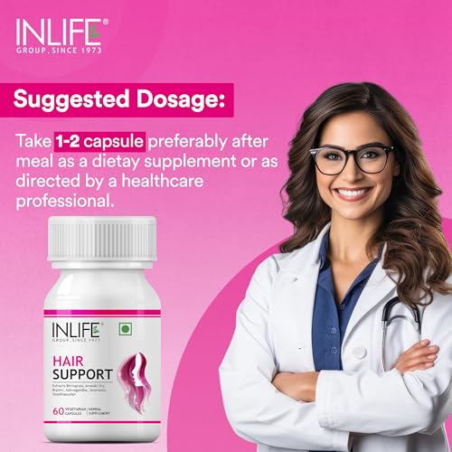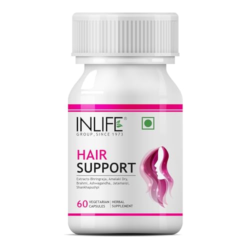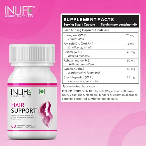 INLIFE Hair Support Supplement, Bhringraj, Brahmi, Ashwagandha and other Ayurvedic Herbs 500 mg - 60 Vegetarian Capsules (Pack of 1, 60)