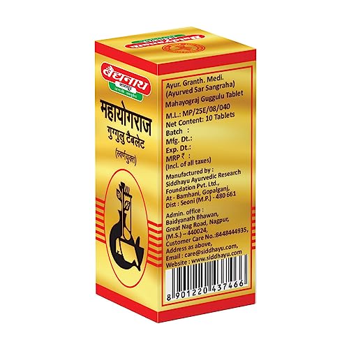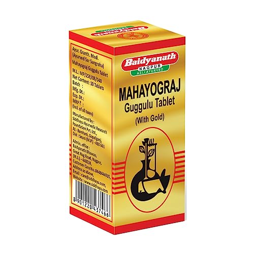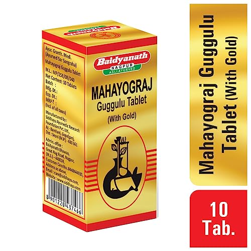 Baidyanath Mahayograj Guggulu Swyu -10 Tablets. One of Indiaâs most respected Companies Shree Baidyanath Ayurved Bhawan Pvt. Ltd. (Kolkata) popularly known as Baidyanath is the acknowledged leader of Ayurvedic know-how. Established in 1917 the Company has played a pioneering role in re-establishing ancient knowledge with modern research and manufacturing techniques. AYURVEDA is a 5000 year old Science of health care and herbal treatment. AYURVEDA is highly effective in common and complicated ailments assures long term relief and has no side effects. AYURVEDA is now backed by modern scientific research and technologies and provides its gentle healing touch to millions around the world.