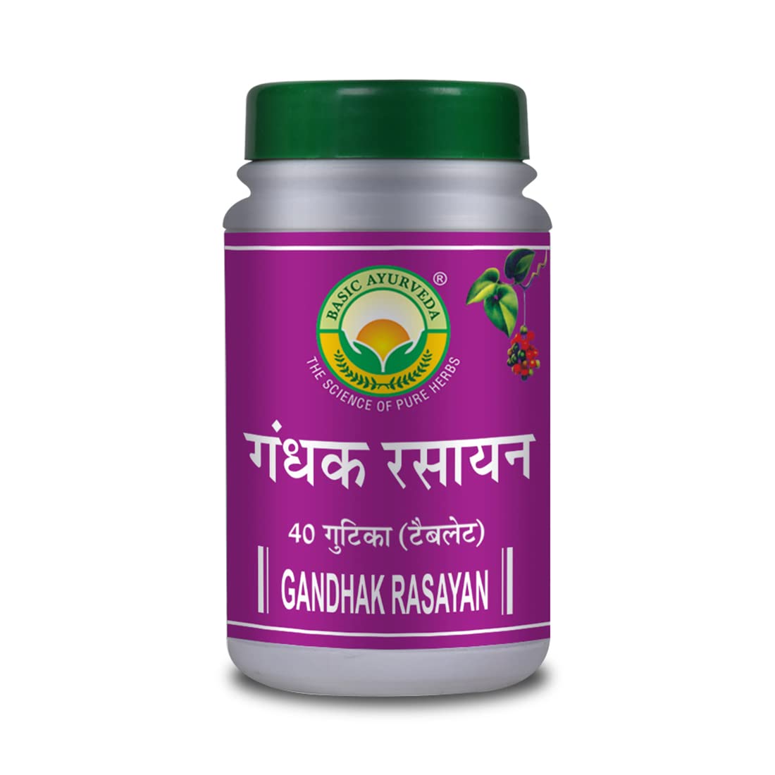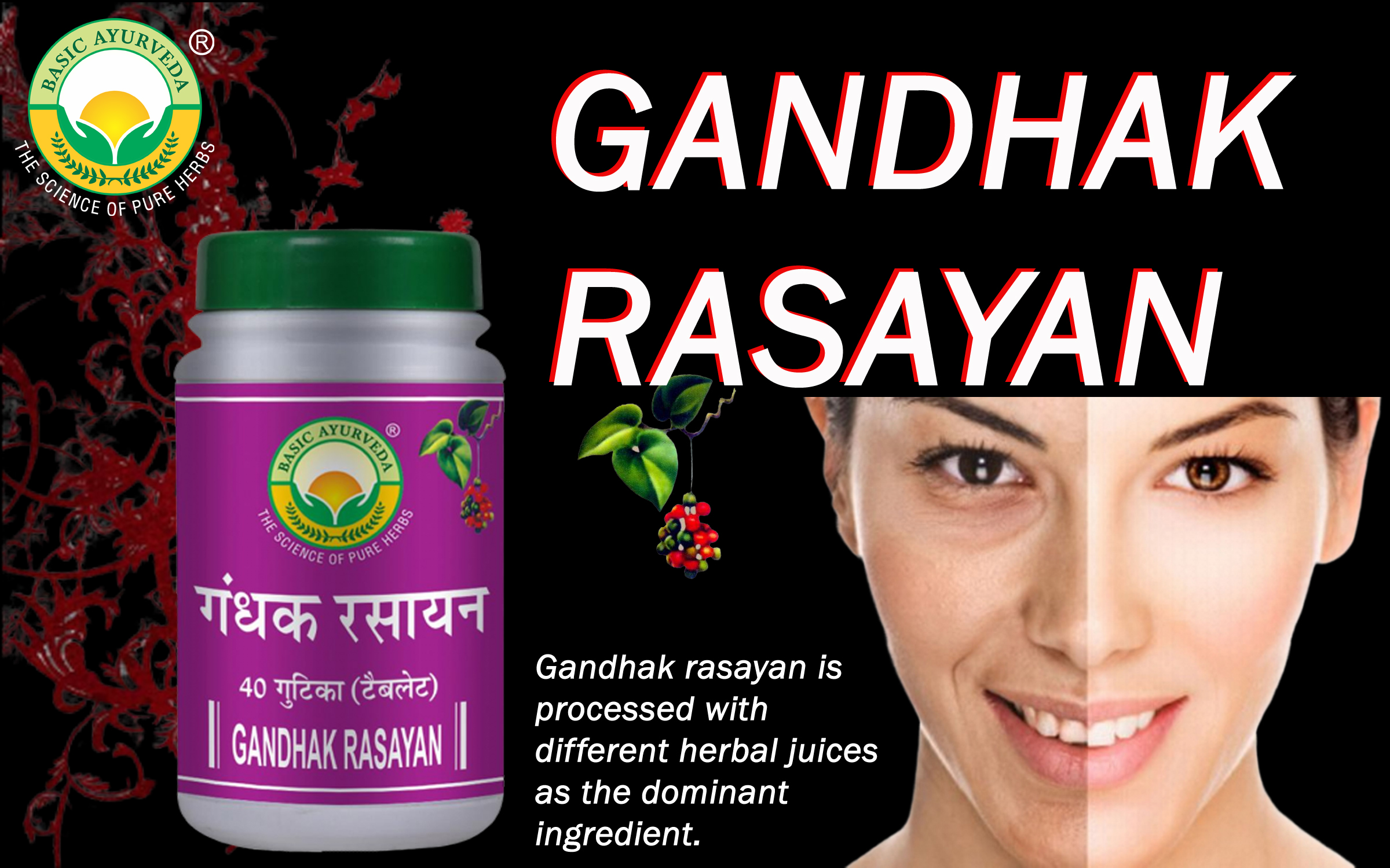 • Basic Ayurveda Gandhak Rasayan is an ayurvedic formulation that comes in tablet form used for many skin-related problems and maintains good skin health. It acts as a blood purifier and liver also cleaning Vata & Kapha.