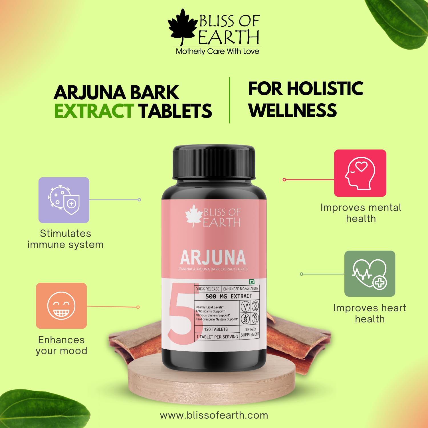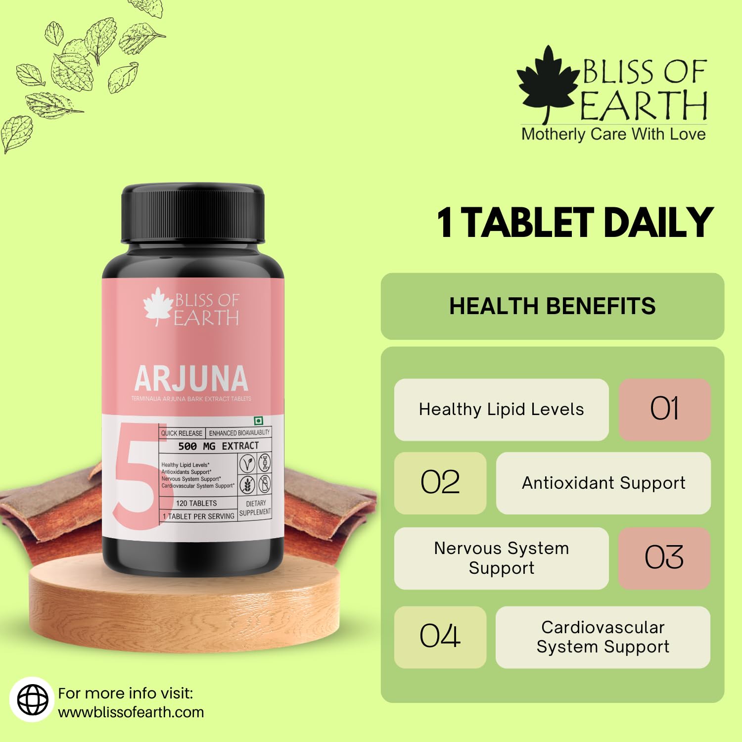 Bliss of Earth Arjuna scientifically known as Terminalia arjuna is a revered herbal supplement celebrated for its potential cardiovascular benefits. These Arjuna tablets offer a convenient and standardized way to incorporate the natural goodness of this traditional Ayurvedic herb into your daily wellness regimen.