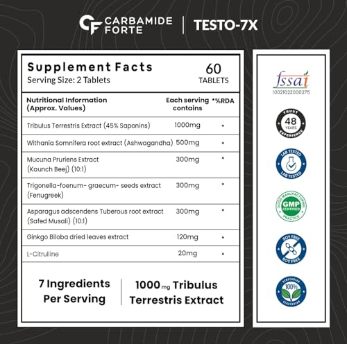 Carbamide Forte Testosterone Supplement Capsule for Men with Tribulus 1000mg, Ashwagandha, L-Citrulline & Kaunch Beej 60 Veg Tablets