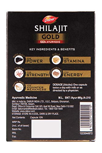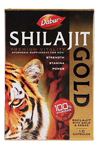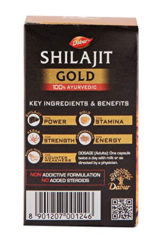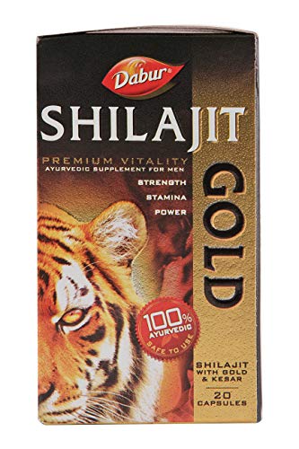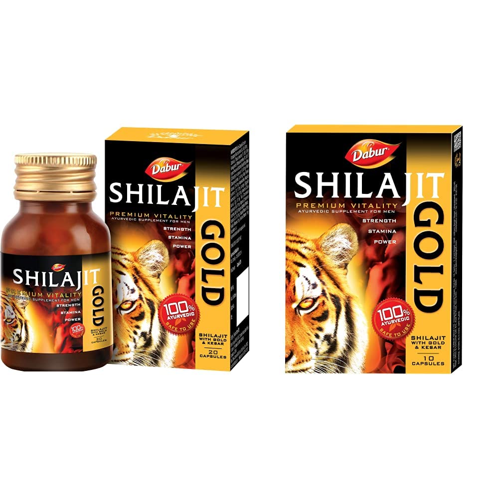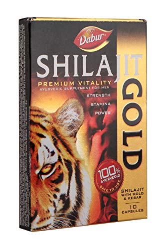 Dabur Shilajit Gold for Strength Stamina and Power - 20 CapsulesDabur Shilajit Gold is a unique combination of Shilajit Gold Kesar and other important herbs like Ashwagandha Kaunch Beej and Safed Musali. Shilajit Gold is good for general health and helps increase strength stamina vigour and vitality.Dabur Shilajit Gold for Strength Stamina and Power - 10 CapsulesThis health tonic helps stimulate the immune system and rejuvenate the bodily tissues to bring about all-round physical vigour in the body and well-being