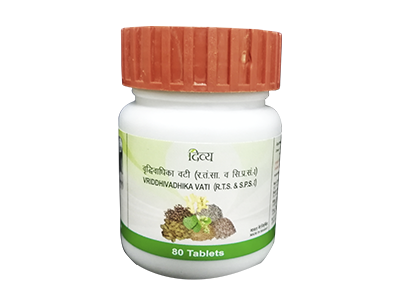 Divya Vriddhivadhika Vati is a herbal mineral formulation used in Ayurveda for an inguinal hernia, intestinal hernia, hydrocele, etc. According to Ayurveda, it mainly acts on VATA DOSHA. It also reduces excess KAPHA.It helps in improving digestion and absorption of nutrients in the body. It brings about balance in stomach acids. It also helps in treating dyspepsia and hyperacidity. It helps in improving the immunity of the body. It is also beneficial in adenitis or any types of growth in the body. It brings about a balance in stomach acids. It also acts as a coolant. It is also known to prevent and treat respiratory disorders. It acts as a strong rejuvenator.Divya VRIDDHIVADHIKA VATI is an ayurvedic product of Swami Ramdev's Patanjali Ayurved and Divya Pharmacy. Aggravation of VATA DOSHA is likely to play role in development of hernia and hydrocele.Dose: 1-2 tablets twice a day after meals with lukewarm water or as directed by the physician.Indications: Useful in hernia and hydrocoele.* All types of hernia* Any type of cellular growth in the body* Hydrocele* Digestive system* Sudha Para* Sudha Gandhak* Lauh Bhasma* Vang Bhasma* Tamra Bhasma* Kansya Bhasma* Hartal Bhasma* Nile Thotha Bhasma* Shankh Bhasma* Kaudi Bhasma* Sounth* Kali Mrich* Pippal* Harad* Baheda* Amla* Chavya* Kachur* Vai Vidang* Vidhara Beej* Pipla Mool* Patha* Hauber* Vach Kadvi* VrihatEla* Devdaru* Sendha Namak* Weed Namak* Samundra Namak* Kala Namak* Sambhar Namak* Chotti Harad