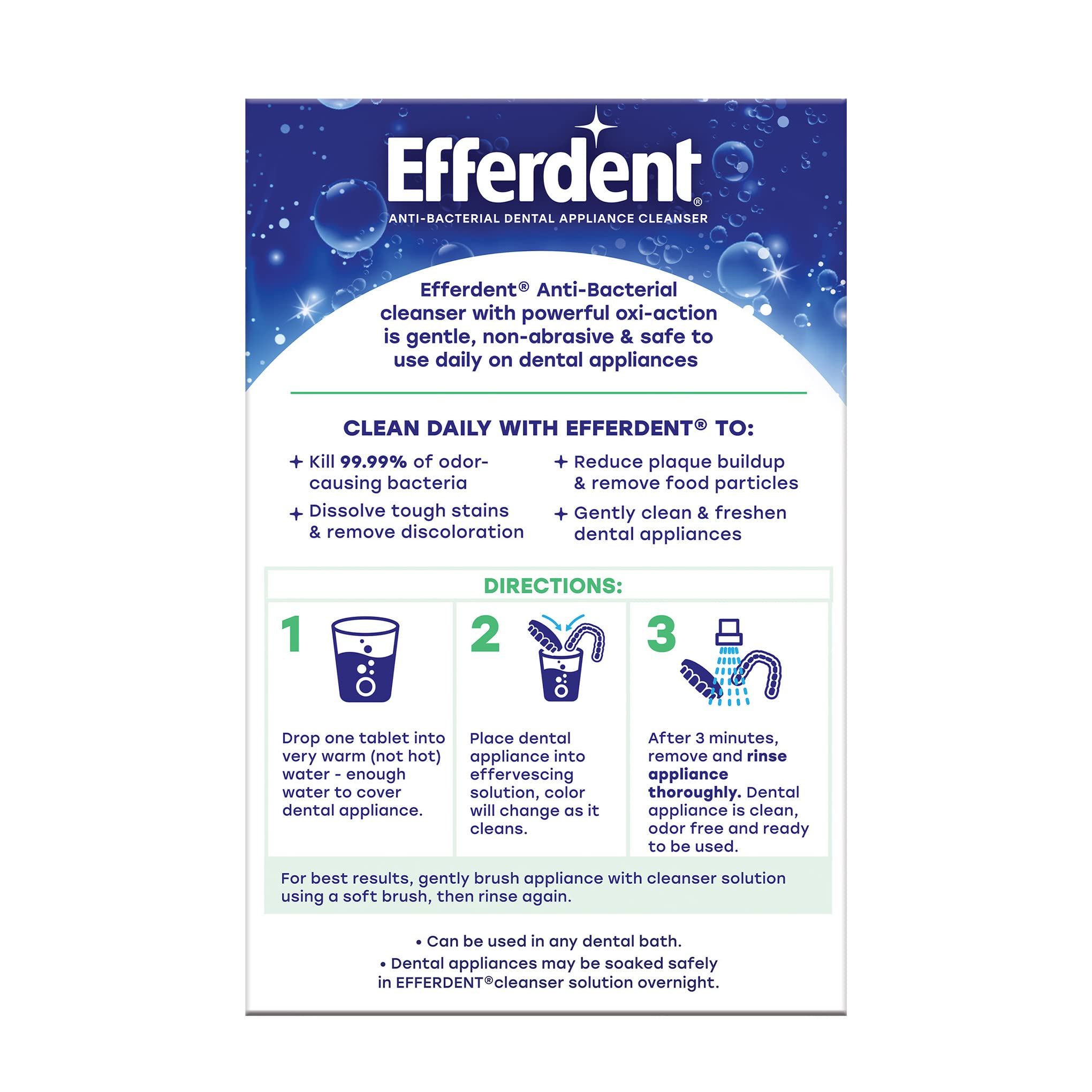 You'll smile with confidence knowing that your teeth and gums are clean bright and healthy. Efferdent Minty Fresh & Clean antibacterial cleaner tablets cleanse dental appliances while giving them a minty fresh flavor. Efferdents Oxi-Action cleaning tablets give a complete clean by eliminating the most stubborn stains in hard-to-reach places. The effervescent cleaning action reduces plaque buildup and brightens retainers dentures and aligners. It also removes food particles that can cause gum irritation so your mouth will feel just as good as it looks. Efferdent Minty Fresh & Clean retainer cleaner tablets kill 99.99% of odor-causing bacteria in 3 minutes; while being gentle non-abrasive and safe to use daily. Efferdent cleans full plate dentures partials retainers aligners and other dental appliances. The cleaner tablets can be used in any dental bath. To use drop one Minty Fresh & Clean tablet into very warm water enough water to cover the dental appliance. Then place the appliance into the effervescing solution which will change color as it cleans. After 3 minutes remove and rinse dental appliance thoroughly. For best results gently brush the appliance with the cleanser solution using a soft brush then rinse again. Efferdent gives a variety of cleaning types: Complete Clean Essential Clean Minty Fresh & Clean and Overnight Clean. Efferdent is the first denture and retainer cleaning tablet brand accepted by the American Dental Association. No wonder dental appliance wearers feel confident when they use Efferdent Dental Appliance Cleansers.