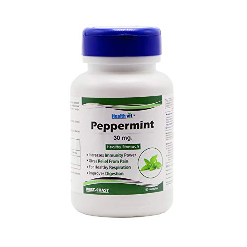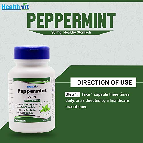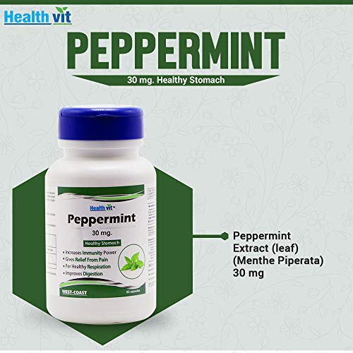 Healthvit peppermint 30mg healthy stomach 60 capsules. Peppermint contains menthol and menthone which are stomach-friendly. It is use as a treatment for indigestion irritable bowel syndrome and headaches. It has soothing effect so use in coughs and other respiratory syndromes. 1. Increases immunity power. 2. Gives relief from pain. 3. For healthy respiration. 4. Improves digestion. Ingredients: Peppermint extract (leaf) (menthe piperata) 30 mg. Suggested use: Take 1 capsule three times daily or as directed by a health care practitioner.