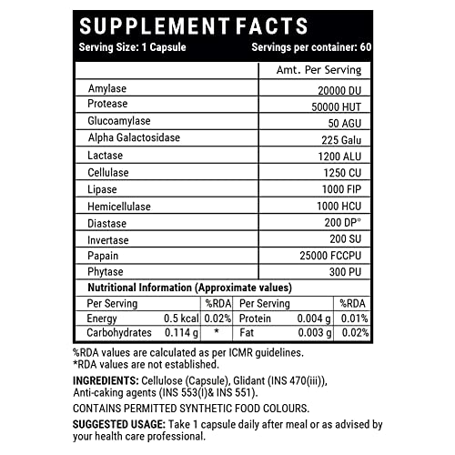 NUTRIENT ABSORPTION: Contains a mixture of vegetarian enzymes developed to promote nutrient bioavailability and absorption. Digestive enzymes are highly specific agents that help transform the food we eat into the nutrition our bodies need. It breaks down fat carbs & protein and optimises nutrient availability.