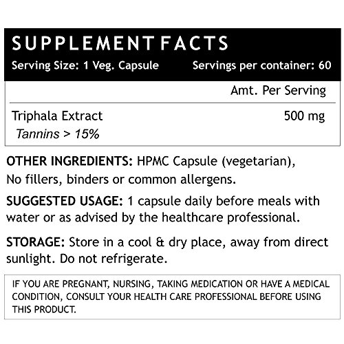 PURE TRIPHALA CAPSULES: It consists of three super fruits: Amalaki (Amla) Bibhitaki and Haritaki. INLIFE Triphala Extract Capsules contain safe natural ingredients and is manufactured to Quality standards. Each vegetarian capsule contains 500 mg pure Triphala extract standardized to 15% Tannins. Tannins are the best known active compound of Triphala and have been attributed with numerous health promoting properties linked to its antioxidant activity. NATURAL DIGESTIVE SUPPORT: Popular for its unique ability to gently cleanse and detoxify the system while simultaneously replenishing and nourishing it this traditional formula supports proper functions of the digestive circulatory respiratory and genitourinary systems. Triphala readily removes excess vata pitta and kapha from the body bringing balance and proper functioning to the system. ANTI-INFLAMMATORY ANTIOXIDANT DETOXIFICATION AGENT: Triphala enables the body to remove toxins and fat cells can control cholesterol levels and is revered as a mild yet powerful colon cleanser. Amla has shown to improve blood flow by promoting healthy nitric oxide levels. NATURAL CELANSER: Triphala tablets assist in natural internal cleansing. As a natural antioxidant triphala nourishes and rejuvenates the tissues. Made from the Quality triphala extract this traditional formula gently maintains regularity supports healthy digestion and promotes absorption. PURITY: Our product contains the most natural and effective formulation of trusted natural ingredients that are carefully processed and manufactured in a GMP certified manufacturing facility so you can be sure that you're safe. Vegan and vegetarian friendly-INLIFE Triphala extract vegetarian capsules is produced in gluten-free capsules and contains no artificial ingredients.