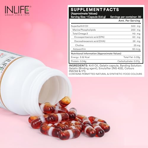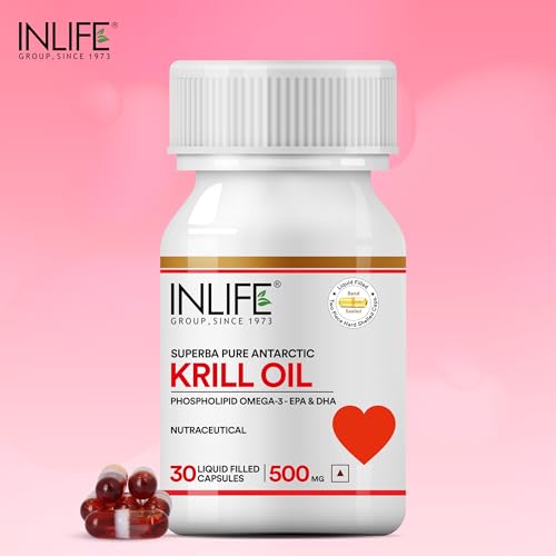 Inlife Krill Oil Capsules contain 500mg of worldâs best quality Krill Oil from SUPERBA derived from Antarctic Krill as its major content. An enriched source of Omega-3 EPA and DHA these help in managing the lipid levels and high valued nutritional content. The liquid filled capsule bears least aqueous solubility with higher potential level. It supports the highest absorption rate and hence it is the best Krill Oil supplement in its range. Every pack contains 30 capsules. INLIFE offers Krill Oil encapsulated in Liquid Filled Capsules. Advantages of liquid filled capsules over soft gels: Contains no plasticizers Improves product stability Low moisture intake Effectively masks taste & odour Band sealing prevents leakages Tamper proof capsules Offers enhanced bio availability. One of the main advantages of liquids is that they are absorbed directly by the body without going through break down stages. Active ingredients in liquid form should therefore be absorbed faster than in solid form. Recommended Dosage - Take one capsule two times daily after meals or as advised by the healthcare professional.