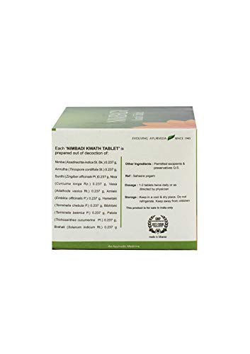 Quantity: 100 Nos; Item Form: Tablets; Nimbadi Kwath Tablet is an ideal ayurvedic formulation primarily used in the treatment of various skin problems like pimples carbuncles etc. If youâre suffering from skin problems for a long time and not satisfied