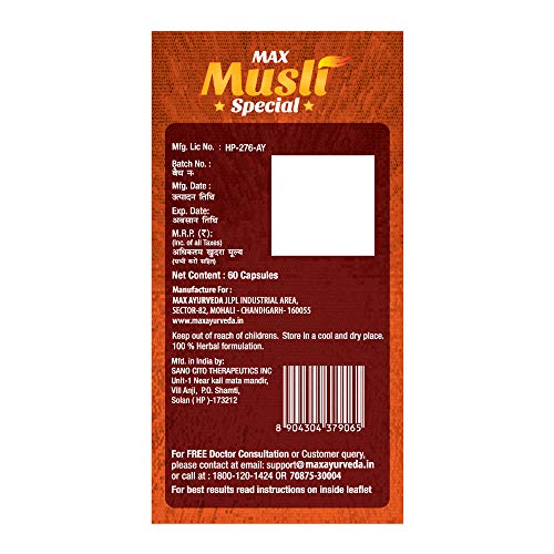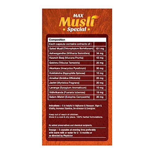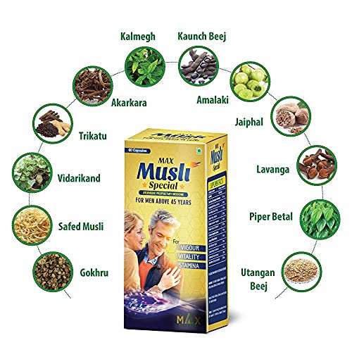 Max Musli Special ( For 45+ Men ) is scientifically formulated from Safed Musli Irani akarkara kaunch Beej Ashwagandha Shuddha Gokhru Jaivitri Amalaki Lavanga Vidhrikand & Salabmishri 11 powerful herbs extracts after extensive trails & approval from Ayush Department - Govt Of India.