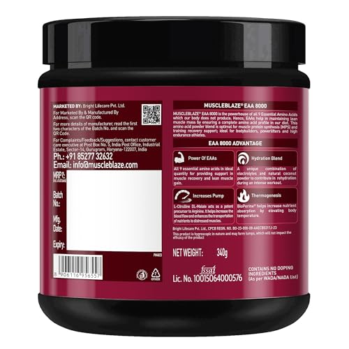Fast muscle recovery is one of the most important aspects of bodybuilding as it helps you stay on track and keep achieving new fitness milestones faster as compared to the long recovery time in-between the exercises. Along with ample rest and a good workout routine your body also needs great nutritional support that can help you power through each workout session. Get good muscle pumps instant energy stamina and strength with the power of 9 Essential Amino Acids in MuscleBlaze EAA 8000 the best EAA supplement on the market. Essential Amino Acids are among the most widely used supplements as they are easily absorbed and give your body the fuel that it needs to perform at its best abilities each time. MuscleBlaze EAA 8000 intra workout supplement is formulated especially keeping the constitution of your muscles in mind to support faster recovery. This vegan intra workout supplement for men and women provides 8 g of EAAs comprising BCAAs (Leucine Isoleucine & Valine) in a ratio of 2:1:1 in each serving. The unique hydration blend keeps you hydrated and energized for longer workouts. This EAA BCAA supplement is enriched with Citrulline & Bioperine which help in enhanced pumps and absorption of nutrients respectively. It has no added sugar or trans fat & contains immunity boosters Zinc and Vitamin C. Enjoy it in two refreshing flavours - Razz Lemonade Blue Cola & Melon Martini.