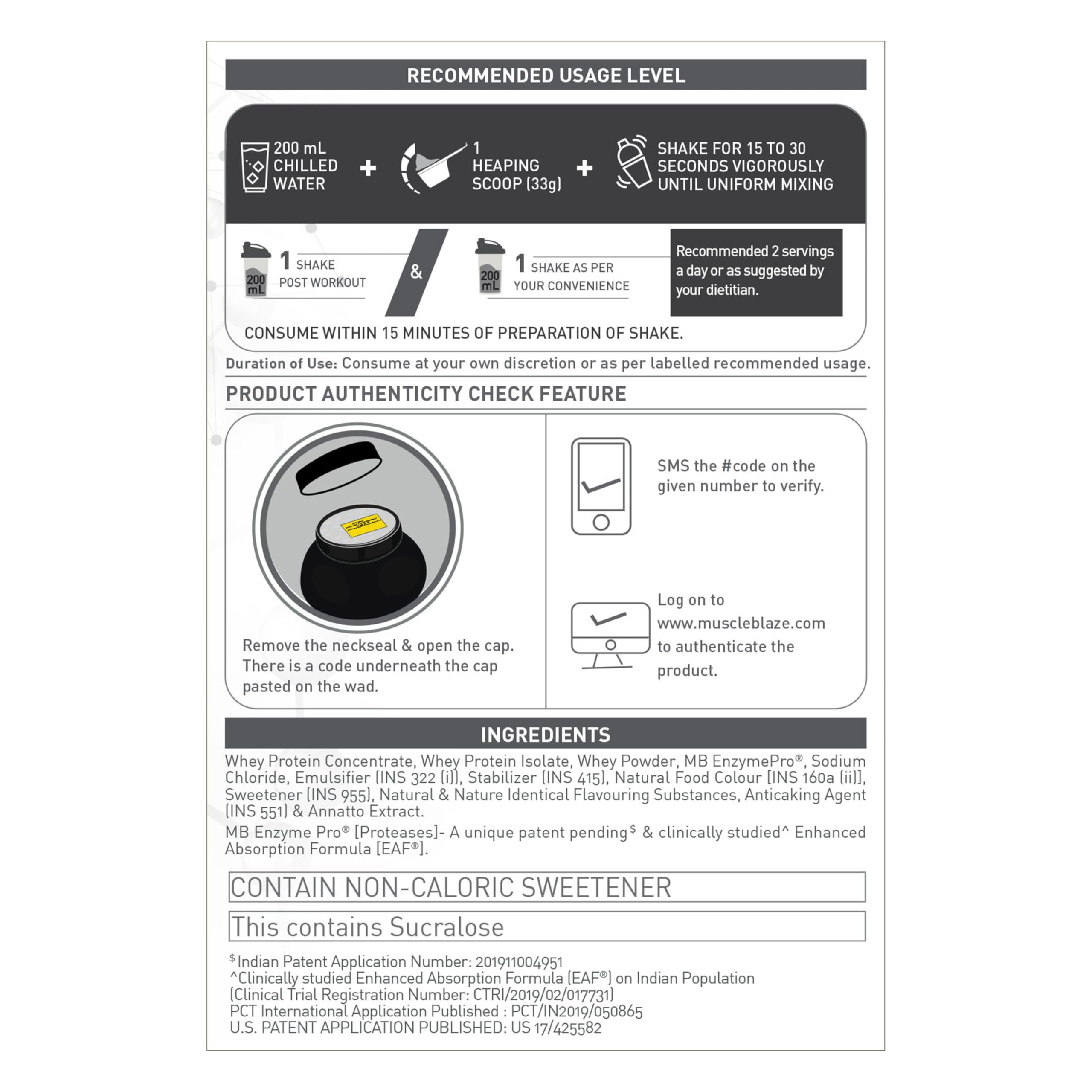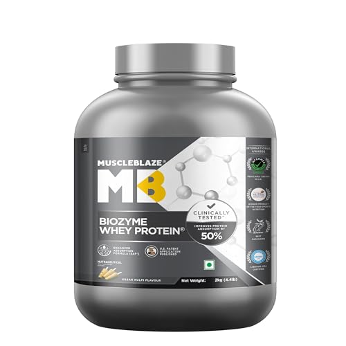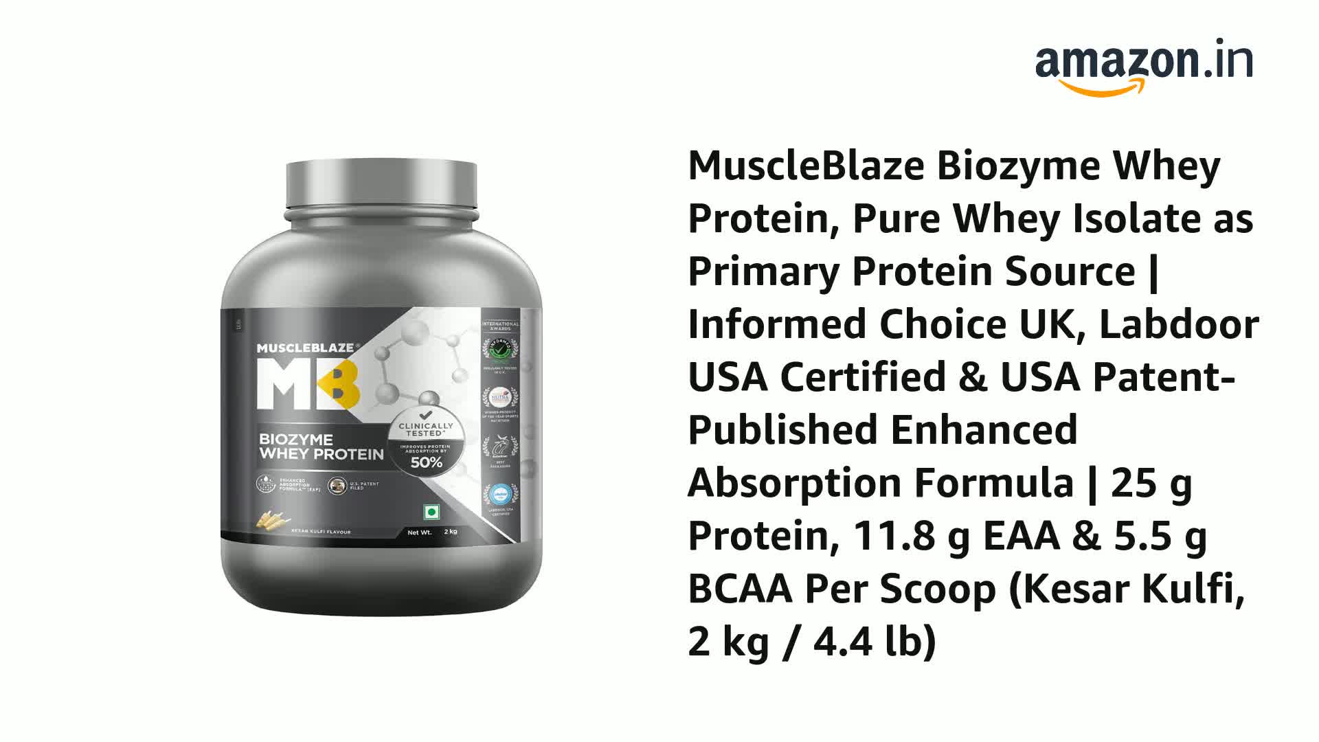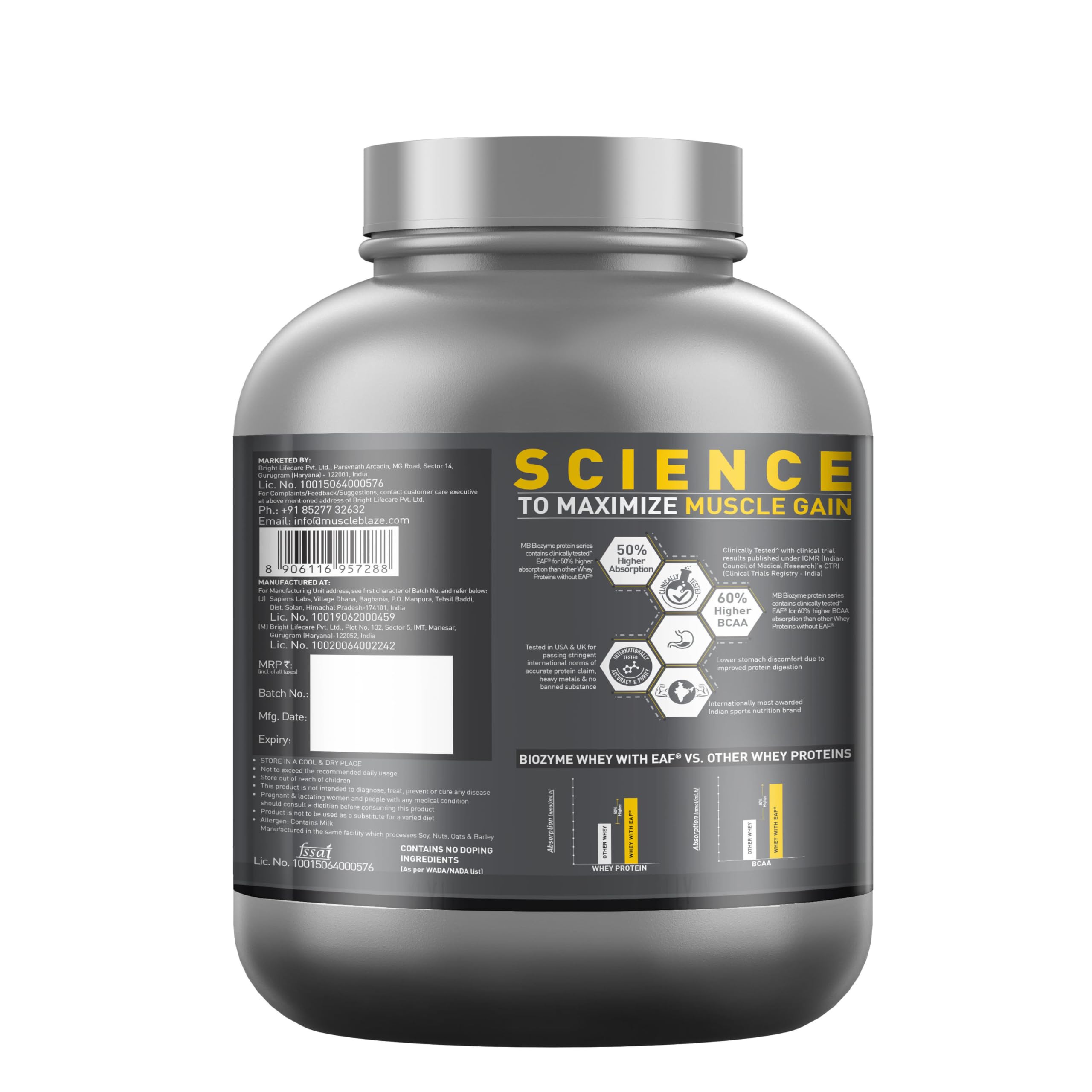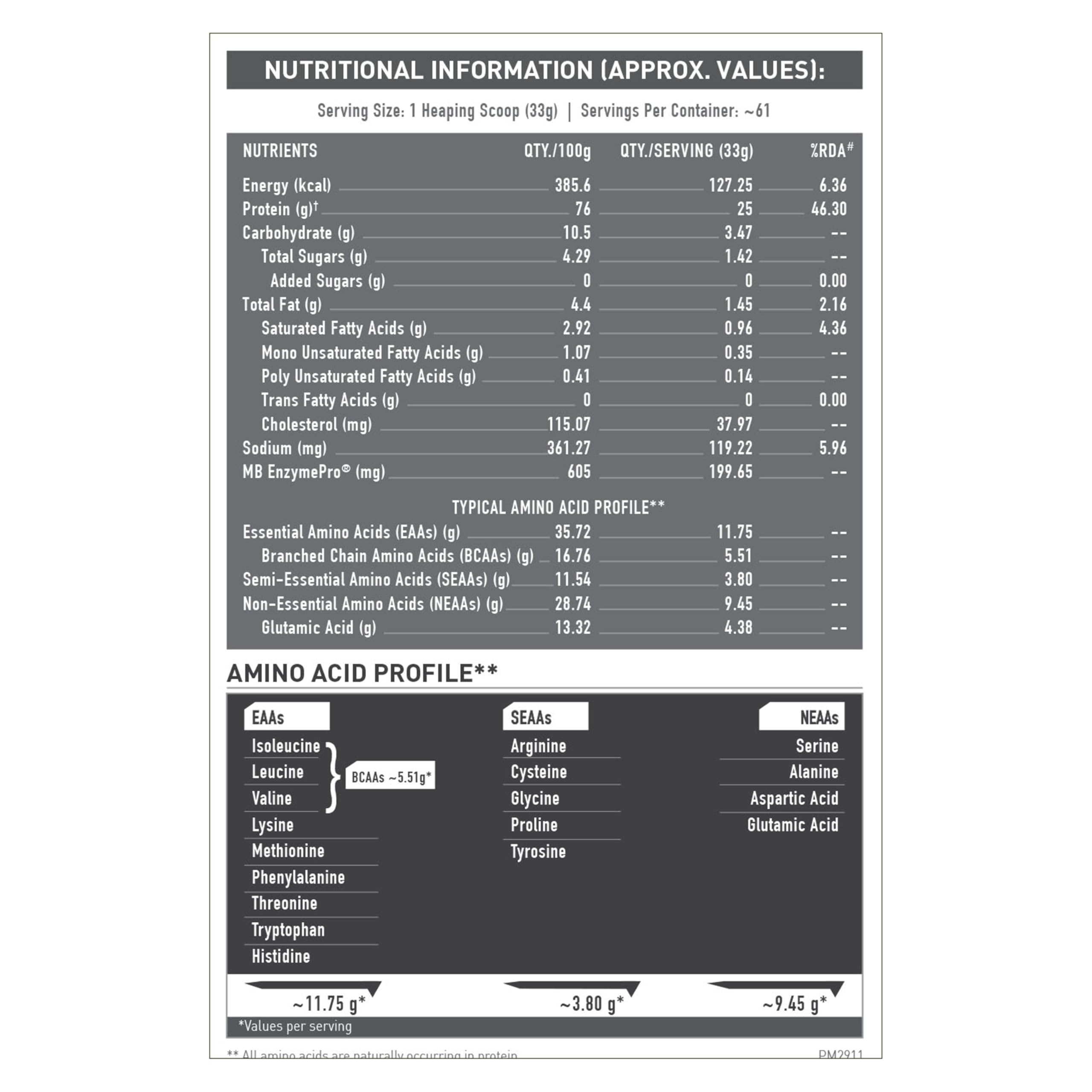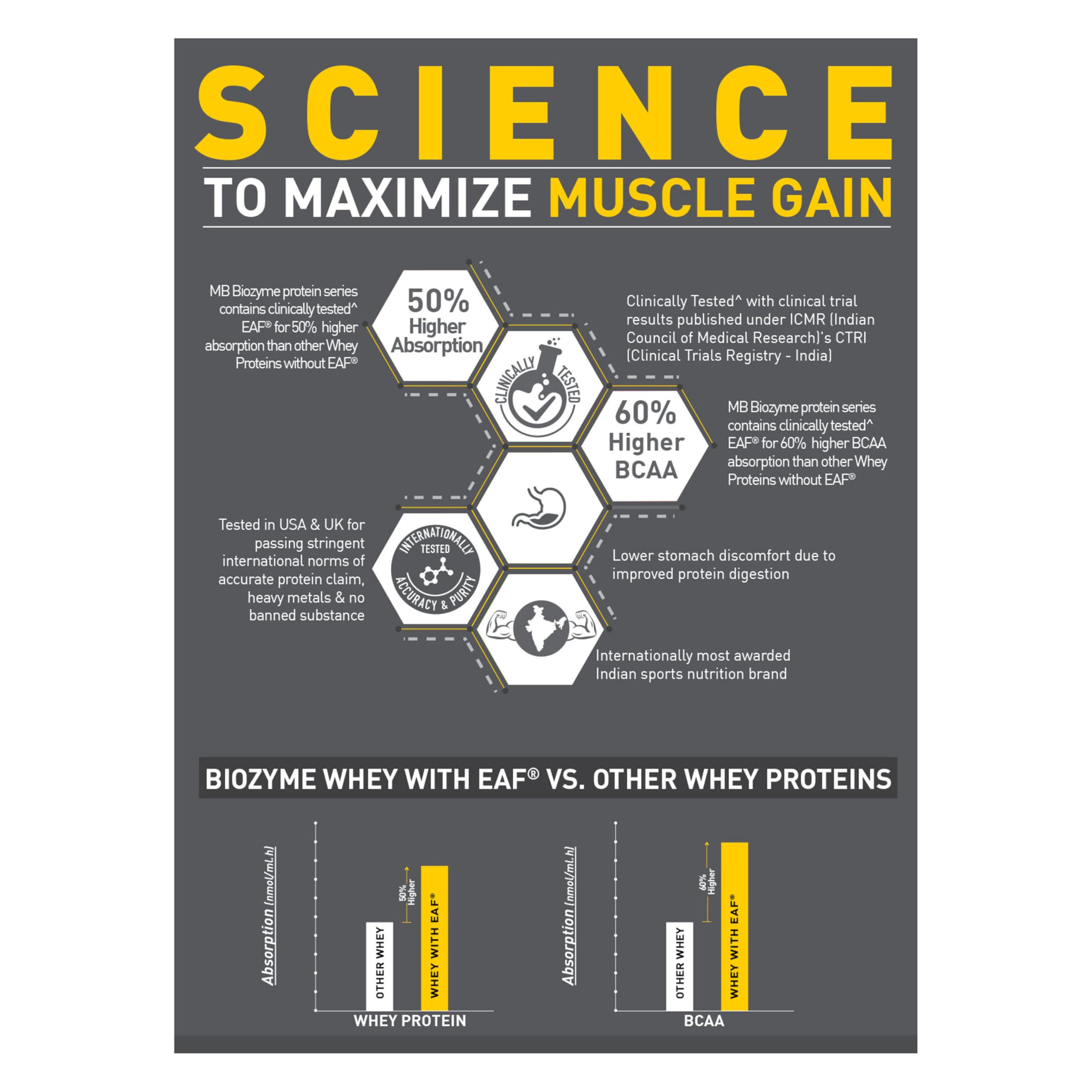 • ENHANCED ABSORPTION FORMULA (EAF ): MB Biozyme Whey Protein ensures 50% higher protein absorption and 60% superior BCAA absorption compared to other whey proteins. This proprietary formulation of MB is an international patent-applied