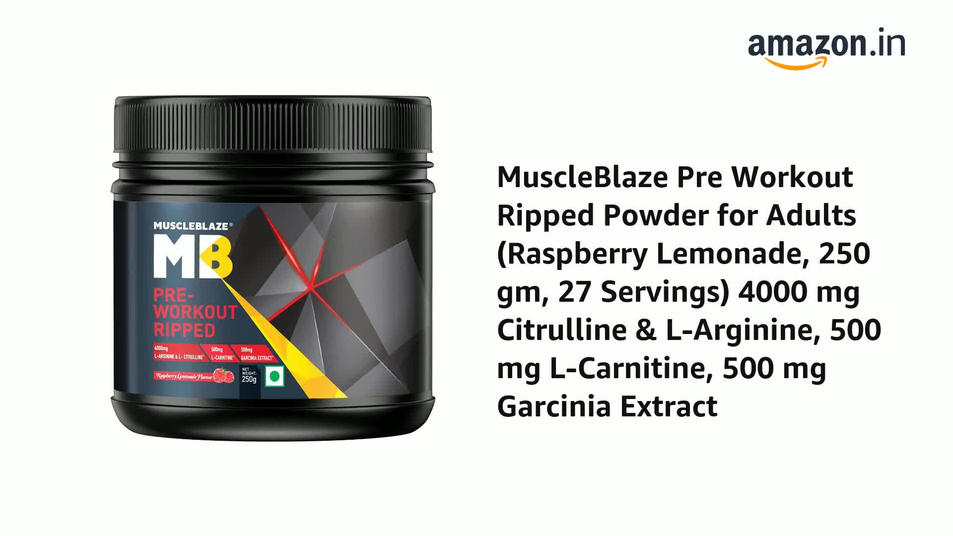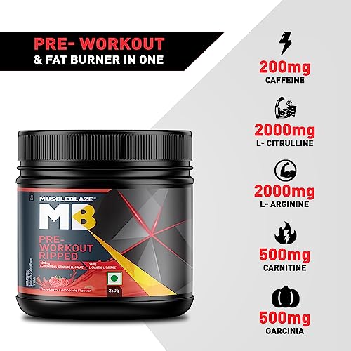 MuscleBlaze Pre Workout Ripped, 4000 mg Citrulline & L-Arginine, 500 mg L-Carnitine, 500 mg Garcinia Extract (Raspberry Lemonade, 250 g, 27 Servings)