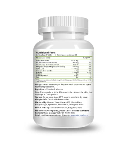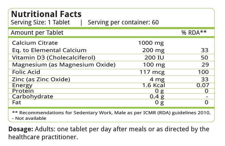 The formulation features a high potency combination of bone-healthy calcium magnesium zinc and vitamin D. Calcium is the primary mineral responsible for bone strength magnesium and vitamin D are essential for proper bone mineralization and zinc is involved in the synthesis of collagen in bone tissue. Calcium (Calcium citrate Malate) 1000 mg Vitamin D3 200 IU Magnesium (as Magnesium Oxide) 100 mg Zinc (as Zinc sulphate) 4 mg Folic Acid 150 mcg
