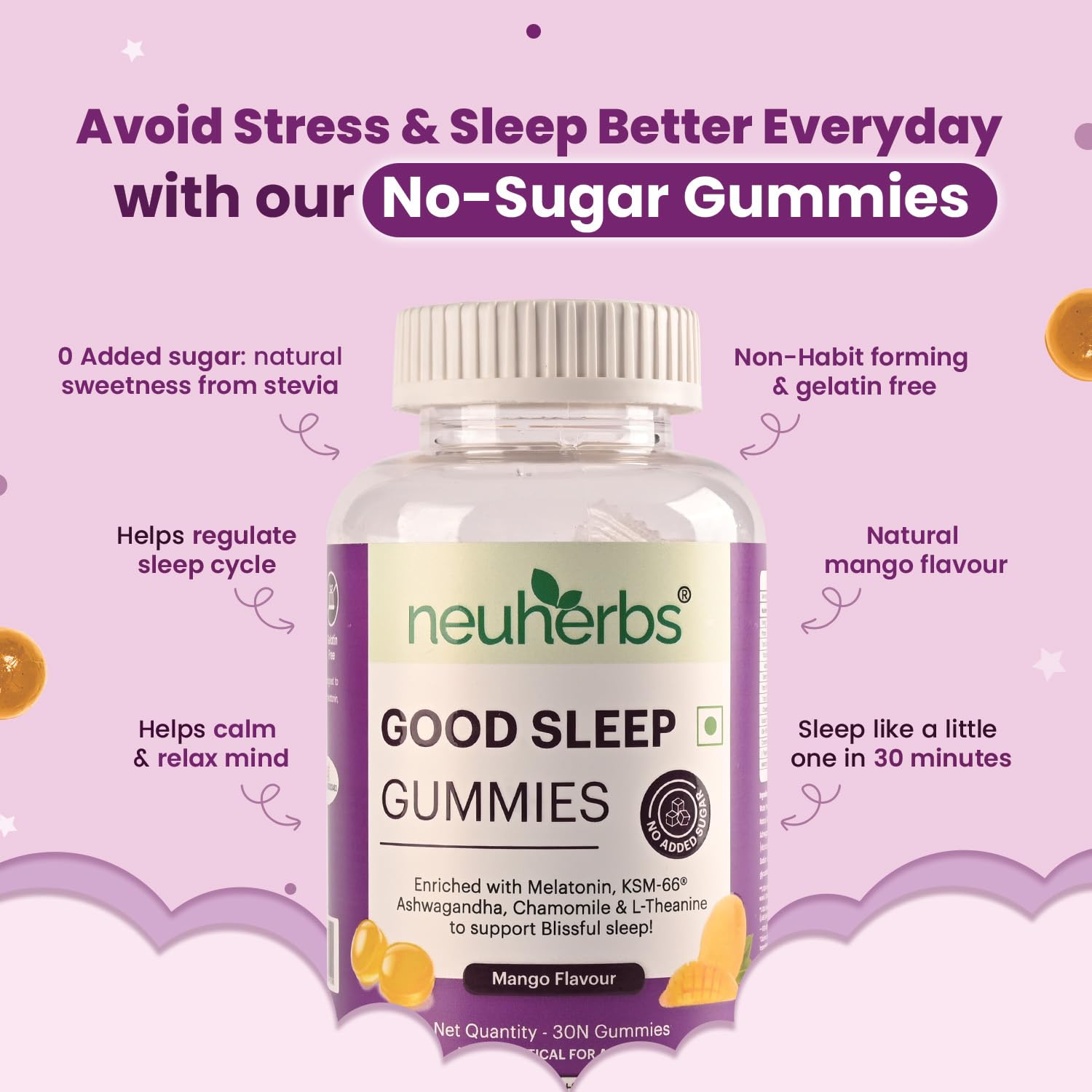 Neuherbs Good Sleep 30 Gummies For Men & WomenMelatoninKsm-66 Ashwagandha ExtractChamomile Extract & L-Theanine Support Blissful Sleep & Reduce StressNatural Mango FlavouredGelatin Free