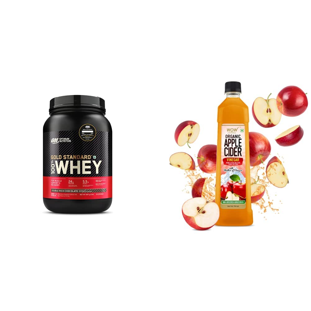 Optimum Nutrition (ON) Gold Standard 100% Whey Protein Powder - 2 lbs 907 g (Double Rich Chocolate) Primary Source IsolateOptimum Nutrition's Gold Standard 100% Whey uses pure Whey Protein Isolates as the primary ingredient. Combined with ultra-filtered whey protein concentrate each serving provides 24 grams of all-whey protein and 5.5 grams of naturally occurring Branched Chain Amino Acids (BCAAs) which are prized by athletes for their muscle building qualities. With 10 tempting flavors to choose from ON Gold Standard 100% Whey gives you plenty of ways to keep workout recovery interesting. To instantly check the authenticity of your ON product SMS us your 6 digit unique code (on the pack) at 57575 or visit our wesite AUTHENTICATEON.inWOW Raw Apple Cider Vinegar - with strand of mother - Not from concentrate - 750mlWOW Apple Cider Vinegar is made from the juice of the finest quality of select apples grown in the orchard of the pristine hills of the Himalayas. Wow Apple Cider Vinegar is 100% natural raw unfiltered & non pasteurised retaining the natural residue and goodness as a mother of vinegars with its richness in natural components.